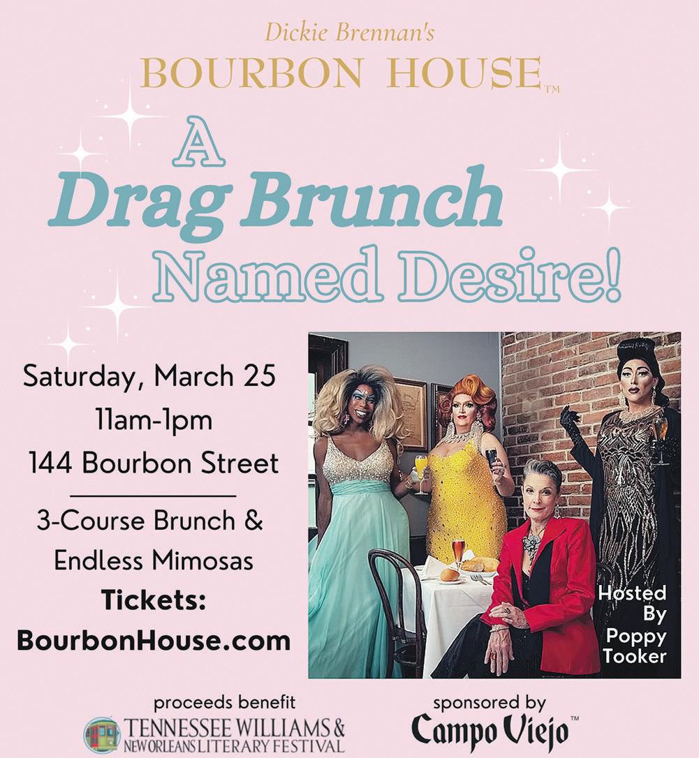 4 GA MB IT > BES TO FN EW OR LE AN S. CO M >M ARCH 21 -2 7>2 02 3 MARCH 21 —MARCH 27,2023 VOLUME 44 || NUMBER12 COVERPHOTO BY DAVIDGRUNFELD ANDGETTY IMAGES COVERDESIGNBYDORASISON Events 13 Concerts 21 OutdoorMusic 25 Festivalsoutside NewOrleans 27 NEWS OpeningGambit. 6 Commentary 7 Clancy DuBos. 9 BlakePontchartrain 11 FEATURES Arts &Entertainment 5 Eat+Drink 29 Music Listings 36 Music 37 GoingOut........................................38 Puzzles. 39 Gambit’sguideto springevents Allthe best in festivals, plays, music, comedy andmore! 12 CONTENTS PHOTOPROVIDEDBY HOGS FOR THECAUSE Gambit (ISSN1089-3520)ispublished weekly by CapitalCity Press,LLC,840 St.Charles Ave., NewOrleans,LA70130 (504)486-5900.Wecannot be heldresponsible forthe return of unsolicited manuscriptsevenifaccompaniedbya SASE.All materialpublished in Gambit is copyrighted: Copyright2023Capital City Press,LLC Allrightsreserved. @The_Gambit @gambitneworleans Publisher | JEANNE EXNICIOS STAFF EDITORIAL )483-3105//response@ mbitweekly.com or | JOHN STANTON calEditor | CLANCY DUBOS &EntertainmentEditor | COVIELLO