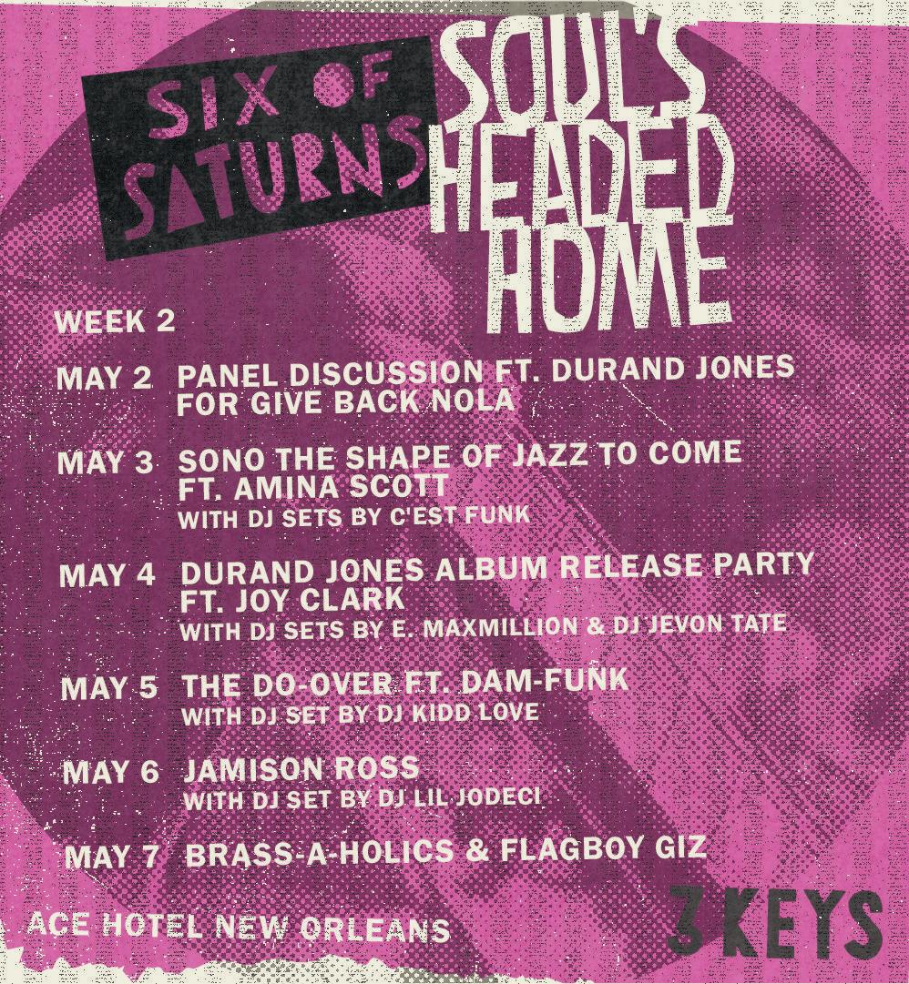 SIXOFSATURNS. TheAce Hotel hostsa musicserieswith livemusic, DJsand parties. Highlightingthe lineupisdrummer and vocalist JamisonRoss, joined by Anjelika “Jelly”Josephand Gabrielle Cavassa, on Saturday,May 6. Soul and R&BsingerDurandJones celebratesthe releaseofasoloalbum, “WaitTil IGet Over,” and JoyClark performs, on Thursday,May 4. Other series performersinclude Brass-A-Holics,Flagboy Gizand bassistAmina Scott. Events run throughMay 7. Visitacehotel.com/ new-orleansfor details