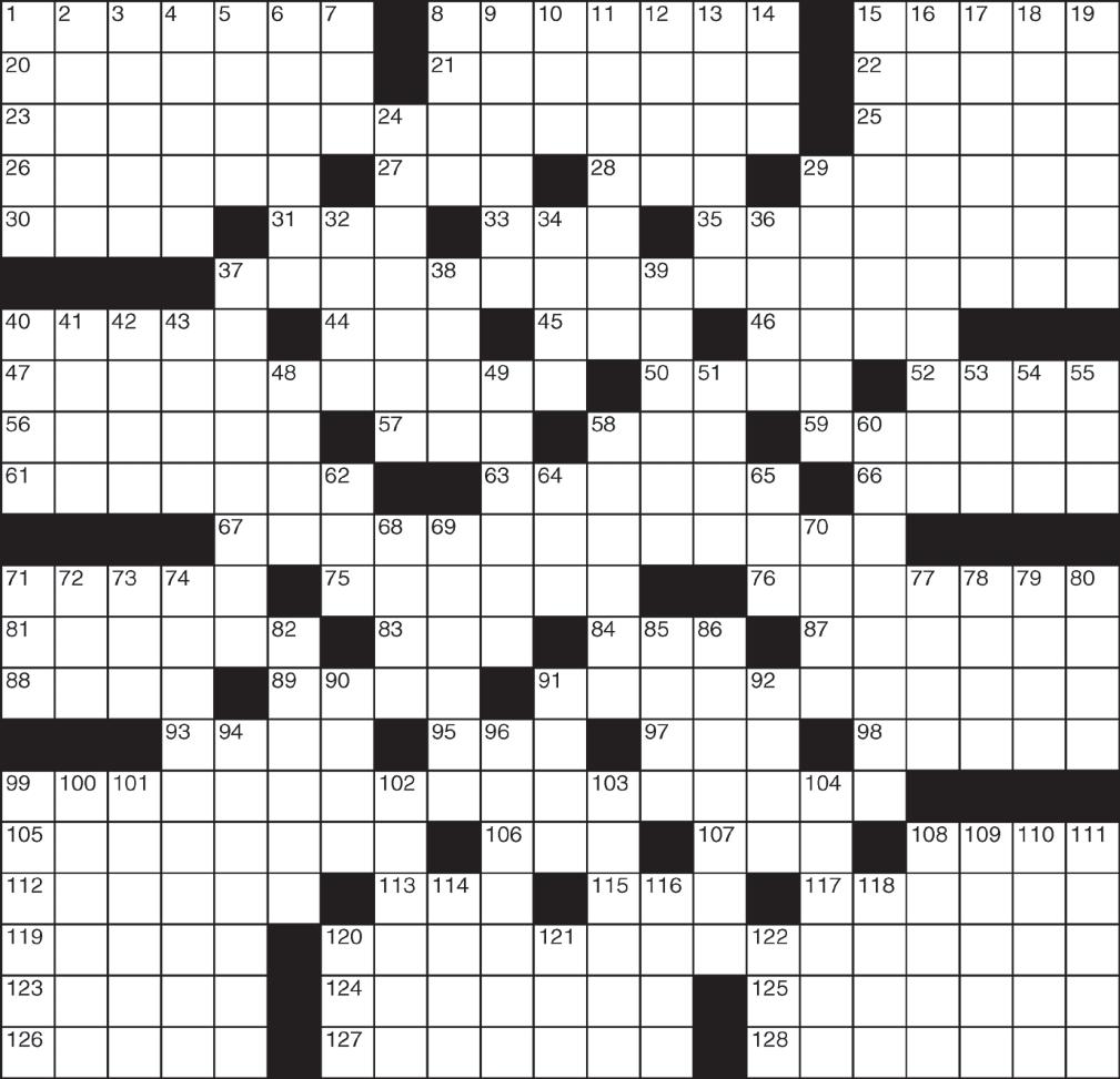 89Enthusiastic 91Focus on what you’ll get if you win 93Bulk beer buy 95Angsty music genre 97Film director DuVernay 98Weighed down (with) 99Support one who ultimately fails 105 2009-17, politically 106 Equal: Prefix 107 “The Addams Family” cousin 108 Poker holding 112 “Nick and — Infinite Playlist” (2008 film) 113 Car navig aid 115 Actor Kilmer 117 Consumed no cooked food 119 Kriss Kringle 120 Conform to one’s political group 123 1989 Disney princess 124 Captivates 125 Kind of spray 126 Latin “that is” 127 Really foolish 128 Paternity prover, perhaps DOWN 1Joe — 2Baltimore ball team, for short 3Decade parts 4Caused 5Jazz singer James 6Enthusiastic 7Hen or heifer 8Mix together 9Wearing dapper duds, with “out” 10“— -la-la!” 11Dog or cat owner’s concern 12Toothy tools 13Bible book before Jeremiah 14Big Apple team, on sports tickers