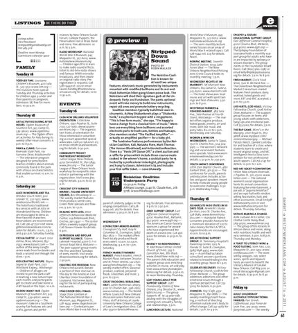 Listings editor: Alex Woodward listingsedit@gambitweekly.com FAX:483-3116 Deadline: noon Monday Submissions edited for space