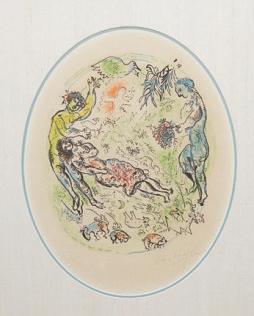 Lot590:MarcChagall (Russian/ French,1887-1985), “And YouWove ForYourTenderNeckSeductive Garlands of RavishingFlowers,” 1967,H.- 15 1/4in.,W.- 13 1/4in., Framed-H.- 29 in., W.-24in. Est. $5,000-$9,000