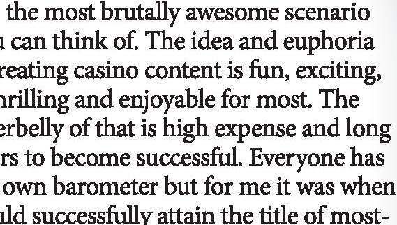 The UK, and more speci cally London, provides us with a double focus this issue – rst we speak with the son of famed gambler Stevie Thomas, Thomas being the subject of a book release this year. Also looking at a time gone by, we review what exactly went wrong at Crockfords... And when you actually look into it, despite its historic reputation, what went wrong is very clear.