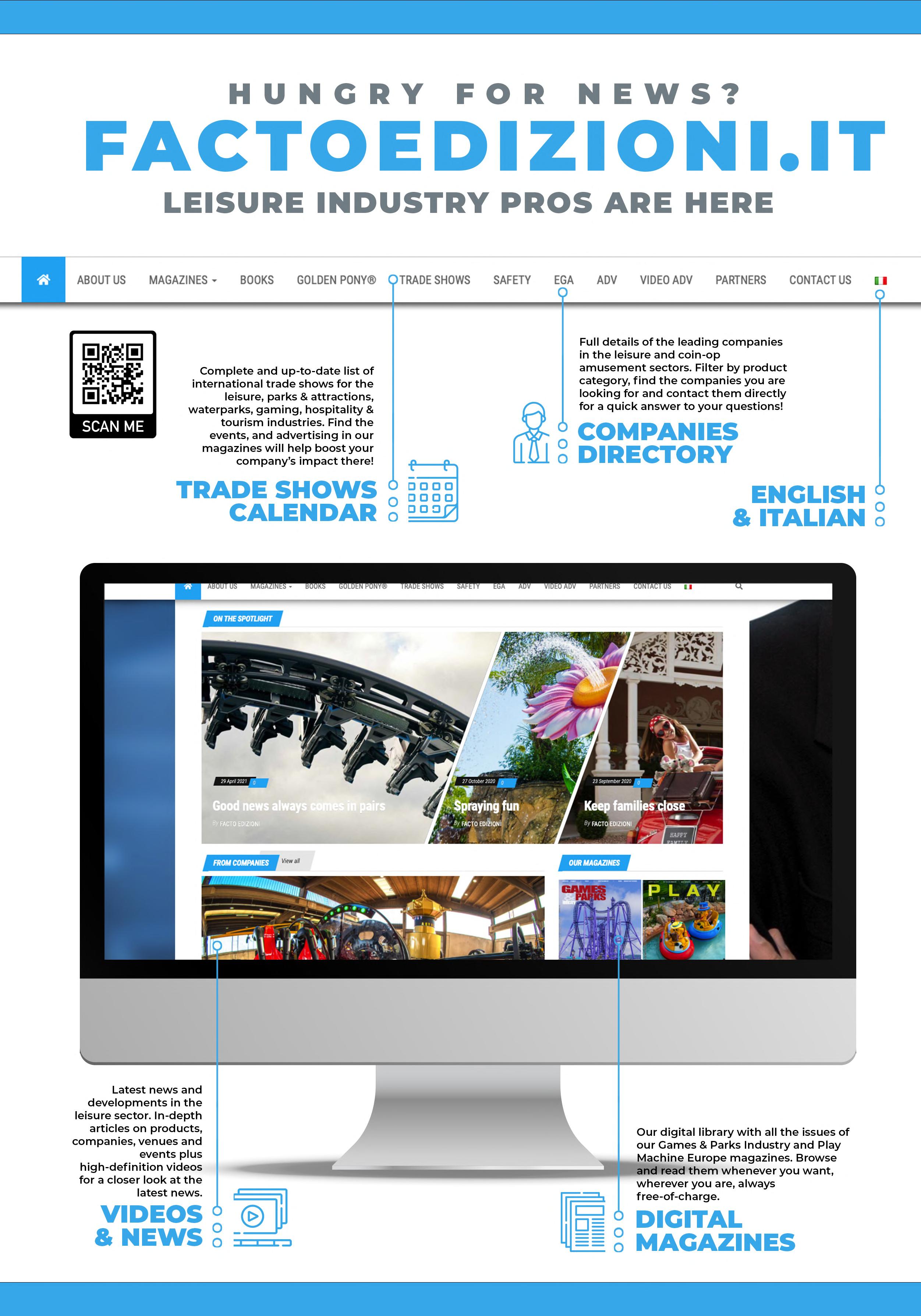ESP ¿Quieres vender tu atracción? Aprovecha la ocasión que Games & Parks Industry te brinda. Pon tu anuncio en la revista impresa tradicional y también online. ¡Aunque todavía hay más! A partir de ahora podrás mandar fotos pero también un vídeo al que se accede en nuestra página web mediante el código QR (junto al anuncio) con todos los Smartphones o en la versión online al hacer clic directamente en el mismo anuncio. Cumplimenta el cupón más abajo para enviarlo a nuestro correo electrónico info@factoedizioni.it y adjunta las mejores fotos y vídeos de tu atracción. ¡No esperes más! Tu anuncio aparecerá en el próximo número.