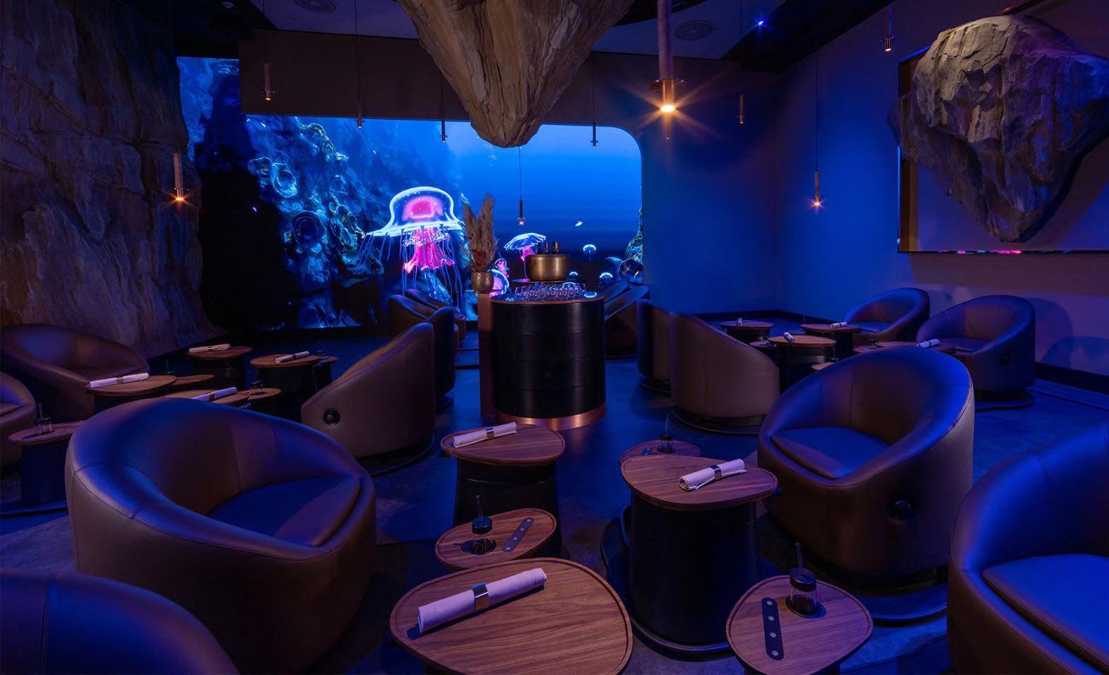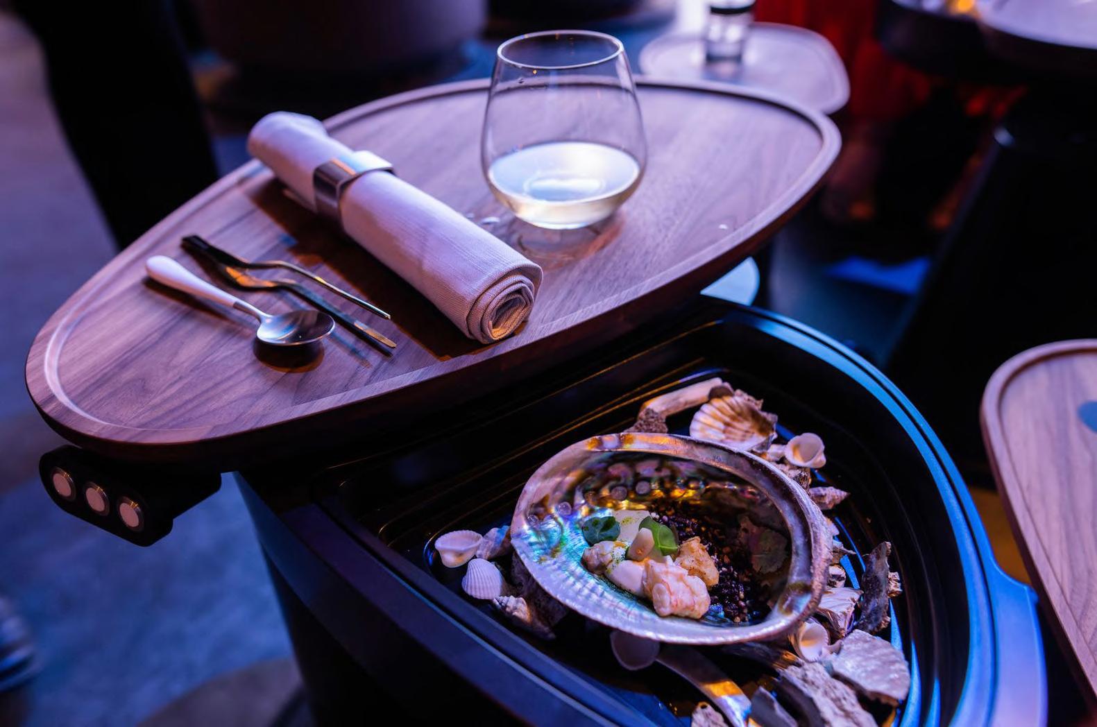 A lo largo de las casi dos horas que dura la experiencia, los huéspedes viajan por las 11 salas del restaurante y con la ayuda de paredes de led, proyecciones, perfumes, sonidos y ochos platos refinados se sumergen en mundos sensoriales emocionantes, basados en termas diferentes, tales como el océano, Asia, una astronave y el universo. Es importante destacar que los huéspedes se desplazan físicamente, pero, eso sí, sin levantarse de sus sillas, ya que lo que se mueve son estos asientos particulares llamados “floating chairs” (literalmente ‘sillas flotantes’). Es un sistema de transporte trackless, desarrollado y patentado por Mack Rides, constituido por ‘vehículos’ (cada uno compuesto por un asiento y una mesa), sofisticados tecnológicamente hasta el punto de que cada uno cuenta con 2.078 componentes. Cada huésped puede regular la altura y la inclinación de su asiento y durante la experiencia se sienta en varias posiciones
