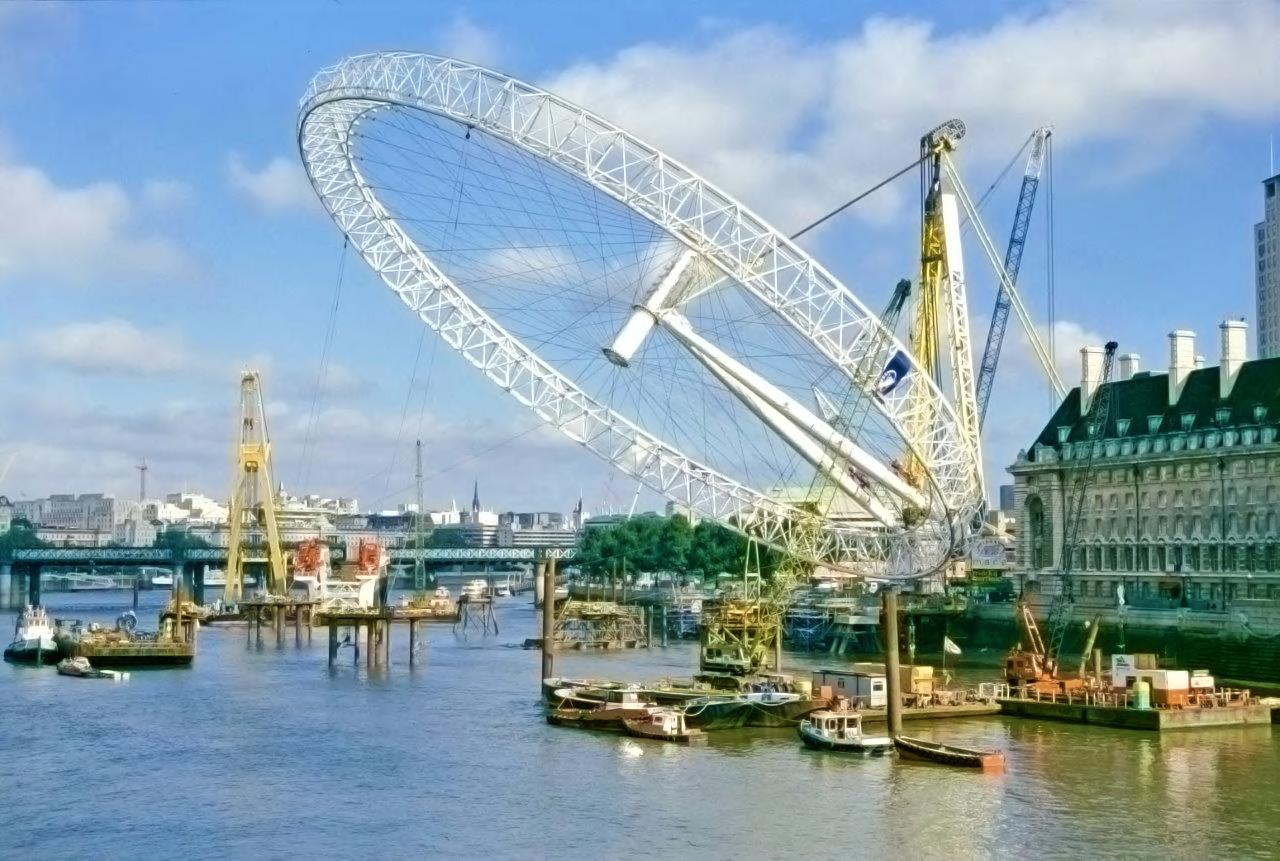 B The erection of the London Eye in 1999. Before being pulled up right, it was assembled lying flat.