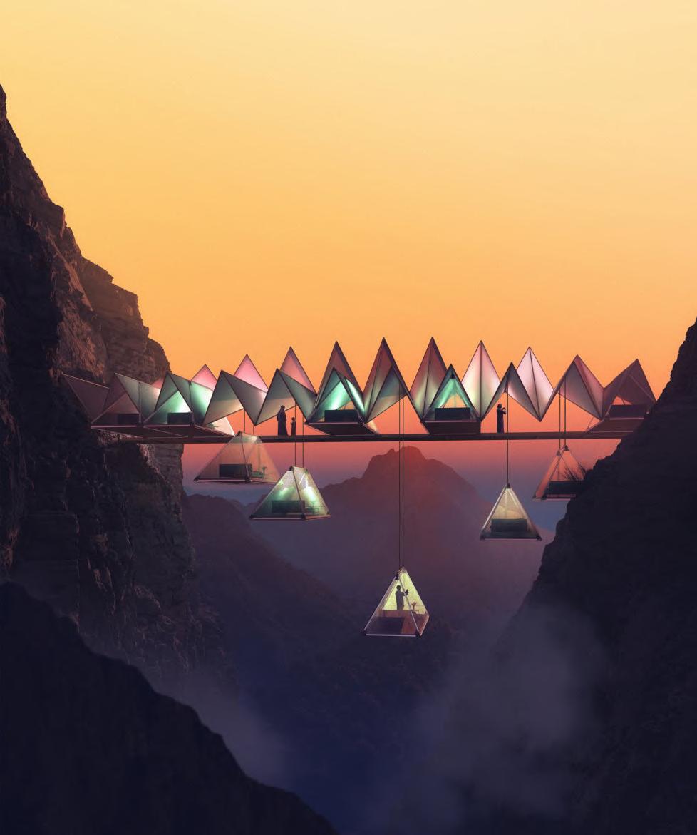 Sviluppato dallo studio di architettura Ardh Architects su incarico dell’autorità dell’emirato arabo Sharjah Investment and Development Authority, questo concept è pensato per offrire un'esperienza glamping non convenzionale e prevede una serie di pod sospesi di forma piramidale, dotati di elettricità, riscaldamento, letti e comfort di lusso come servizio in camera e intrattenimenti. Il concetto iniziale prevede dieci tende, ciascuna per massimo due ospiti, i quali stabiliranno a che altezza porre i loro alloggi.