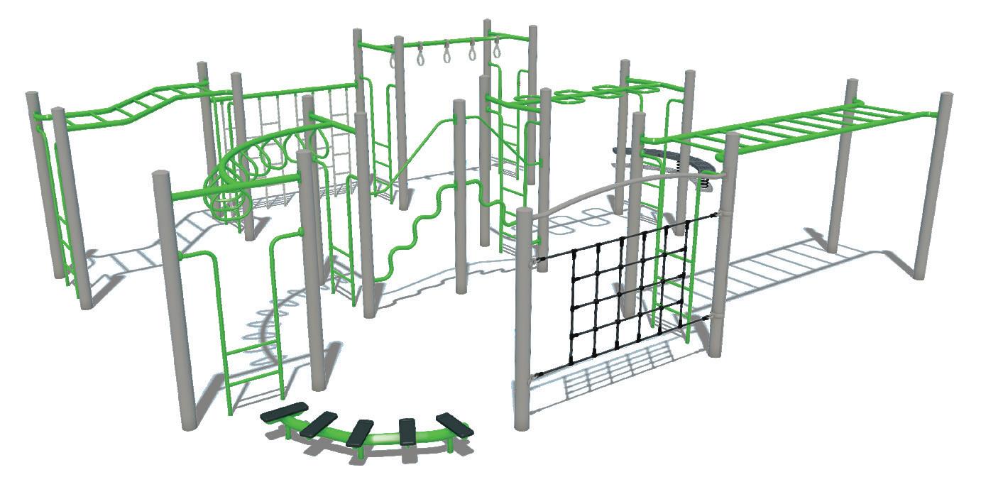 The combination of angled and leaning ladders, an HDPE climbing wall, and elevated grip rails provide multiple routes and paths of travel.