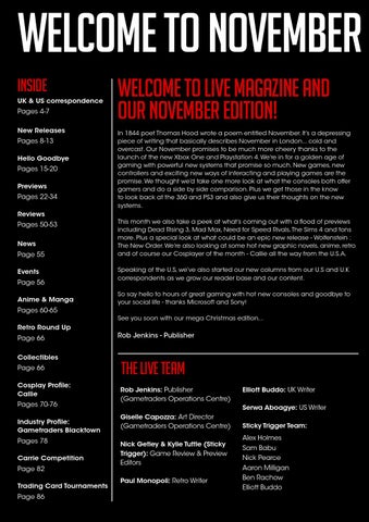 Welcome to Live Magazine and our NOVEMBER edition! In 1844 poet Thomas Hood wrote a poem entitled November. It’s a depressing piece of writing that basically describes November in London... cold and overcast. Our November promises to be much more cheery thanks to the launch of the new Xbox One and Playstation 4. We’re in for a golden age of gaming with powerful new systems that promise so much. New games, new controllers and exciting new ways of interacting and playing games are the promise. We thought we’d take one more look at what the consoles both offer gamers and do a side by side comparison. Plus we get those in the know to look back at the 360 and PS3 and also give us their thoughts on the new systems. This month we also take a peek at what’s coming out with a flood of previews including Dead Rising 3, Mad Max, Need for Speed Rivals, The Sims 4 and tons more. Plus a special look at what could be an epic new release - Wolfenstein : The New Order. We’re also looking at some hot new graphic novels, anime, retro and of course our Cosplayer of the month - Callie all the way from the U.S.A. Speaking of the U.S, we’ve also started our new columns from our U.S and U.K correspondents as we grow our reader base and our content. So say hello to hours of great gaming with hot new consoles and goodbye to your social life - thanks Microsoft and Sony! See you soon with our mega Christmas edition...
