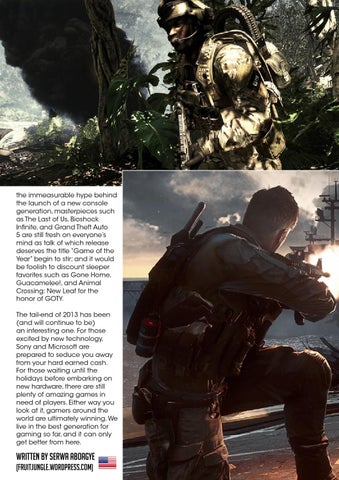 the immeasurable hype behind the launch of a new console generation, masterpieces such as The Last of Us, Bioshock Infinite, and Grand Theft Auto 5 are still fresh on everyone’s mind as talk of which release deserves the title “Game of the Year” begin to stir; and it would be foolish to discount sleeper favorites such as Gone Home, Guacamelee!, and Animal Crossing: New Leaf for the honor of GOTY. The tail-end of 2013 has been (and will continue to be) an interesting one. For those excited by new technology, Sony and Microsoft are prepared to seduce you away from your hard earned cash. For those waiting until the holidays before embarking on new hardware, there are still plenty of amazing games in need of players. Either way you look at it, gamers around the world are ultimately winning. We live in the best generation for gaming so far, and it can only get better from here.