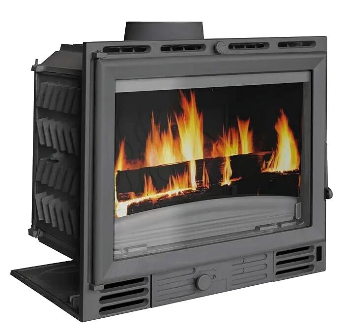 Doble cuerpo en acero de 3 y 4 mm y doble combustión. Volumen de calefacción de hasta 210 m3. Con leñero y troncos de hasta 60 cm.