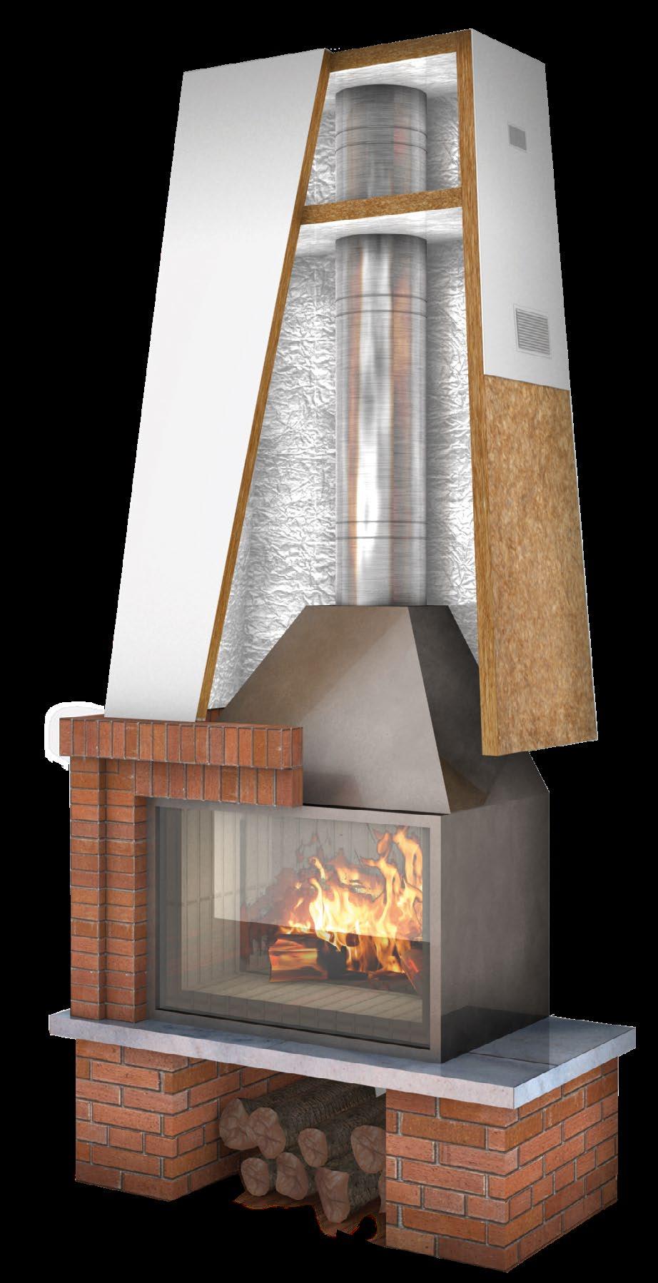 Aplicació Aïllament tèrmic de xemeneies. El panell de llana de roca es col·loca a la part posterior de la llar i a l'interior de la campana amb la cara d'alumini cap al costat calent.