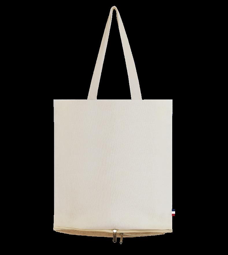 Tote bag en coton et jute, confectionné en France à partir de coton recyclé, certifié Origine France Garantie.