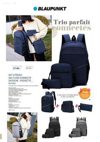 SET 3 PIÈCES SAC À DOS CONNECTÉ SACOCHE - POCHETTE BLP0360 Set polyvalent idéal pour les déplacements quotidiens ou les voyages d’affaires Sac à dos connecté Port USB et sortie écouteurs sur le côté Compartiment intérieur matelassé pour ordinateur Dos et anses matelassés et rembourrés Poche zippée à l’extérieur Bande réfléchissante sur le devant Adapté aux tablettes et aux ordinateurs portables jusqu’à 15’’ Deux poches latérales filet Dimensions : 270 x 420 x 120 mm Sacoche Compartiment central zippé Poche zippée sur le devant Bandoulière ajustable Dimensions : 200 x 230 x 40 mm Pochette Compartiment central zippé Lanière textile Dimensions : 180 x 90 mm La batterie de secours et les écouteurs ne sont pas fournis Matière : Oxford