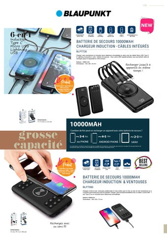 BATTERIE DE SECOURS 10000MAH CHARGEUR INDUCTION & VENTOUSES BLP7080 Chargeur externe avec ventouses positionnées en face arrière pour le fixer au dos de otre smartphone ou à n’importe quel endroit pour plus de praticité. Chargez votre smartphone/tablette avec un câble ( 2 ports USB - 1 port Type C) ou en induction (pour téléphones compatibles) Batterie 10000mAh Dimensions : 138 x 68 x 15 mm