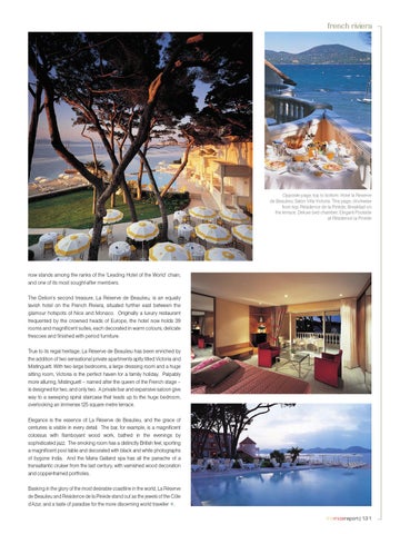 now stands among the ranks of the ‘Leading Hotel of the World’ chain, and one of its most sought-after members. The Delion’s second treasure, La Réserve de Beaulieu, is an equally lavish hotel on the French Riviera, situated further east between the glamour hotspots of Nice and Monaco. Originally a luxury restaurant frequented by the crowned heads of Europe, the hotel now holds 39 rooms and magnificent suites, each decorated in warm colours, delicate frescoes and finished with period furniture. True to its regal heritage, La Réserve de Beaulieu has been enriched by the addition of two sensational private apartments aptly titled Victoria and Mistinguett. With two large bedrooms, a large dressing room and a huge sitting room, Victoria is the perfect haven for a family holiday. Palpably more alluring, Mistinguett – named after the queen of the French stage – is designed for two, and only two. A private bar and expansive saloon give way to a sweeping spiral staircase that leads up to the huge bedroom, overlooking an immense 125 square metre terrace. Elegance is the essence of La Réserve de Beaulieu, and the grace of centuries is visible in every detail. The bar, for example, is a magnificent colossus with flamboyant wood work, bathed in the evenings by sophisticated jazz. The smoking room has a distinctly British feel, sporting a magnificent pool table and decorated with black and white photographs of bygone India. And the Maria Galland spa has all the panache of a transatlantic cruiser from the last century, with varnished wood decoration and copper-framed portholes. Basking in the glory of the most desirable coastline in the world, La Réserve de Beaulieu and Résidence de la Pinède stand out as the jewels of the Côte d’Azur, and a taste of paradise for the more discerning world traveller ◆. themicereport | 131