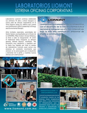 estrena oficinas corporativas Laboratorios Liomont continúa celebrando sus primeros 75 años y ahora inaugura su nueva sede de oficinas corporativas en la Torre Espacio Santa Fe, edificio que cuenta con Certificación LEED (Leadership in Energy and Enviromental Design). Ante invitados especiales, autoridades del Sector Salud y acompañados por el titular de la COFEPRIS, Mikel Andoni Arriola Peñalosa, se llevó a cabo la inauguración. Al cortar el tradicional listón inaugural, su director general, Alfredo Rimoch, manifestó: “Me encuentro muy satisfecho y orgulloso por lo hasta hoy logrado por todo el equipo de Laboratorios Liomont, pues somos una empresa en constante crecimiento que siempre se ha preocupado por el desarrollo y bienestar de la gente, y nuestras nuevas oficinas así lo demuestran”.