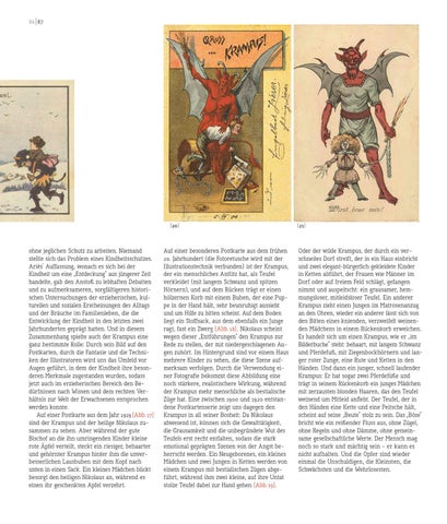 ohne jeglichen Schutz zu arbeiten. Niemand stellte sich das Problem eines Kindheitsschutzes. Ariès’ Auffassung, wonach es sich bei der Kindheit um eine „Entdeckung“ aus jüngerer Zeit handelte, gab den Anstoß zu lebhaften Debatten und zu aufmerksameren, sorgfältigeren historischen Untersuchungen der erzieherischen, kulturellen und sozialen Erscheinungen des Alltags und der Bräuche im Familienleben, die die Entwicklung der Kindheit in den letzten zwei Jahrhunderten geprägt hatten. Und in diesem Zusammenhang spielte auch der Krampus eine ganz bestimmte Rolle: Durch sein Bild auf den Postkarten, durch die Fantasie und die Techniken der Illustratoren wird uns das Umfeld vor Augen geführt, in dem der Kindheit ihre besonderen Merkmale zugestanden wurden, sodass jetzt auch im erzieherischen Bereich den Bedürfnissen nach Wissen und dem rechten Verhältnis zur Welt der Erwachsenen entsprochen werden konnte. Auf einer Postkarte aus dem Jahr 1919 [Abb. 17] sind der Krampus und der heilige Nikolaus zusammen zu sehen. Aber während der gute Bischof an die ihn umringenden Kinder kleine rote Äpfel verteilt, steckt ein riesiger, behaarter und gehörnter Krampus hinter ihm die unverbesserlichen Lausbuben mit dem Kopf nach unten in einen Sack. Ein kleines Mädchen blickt besorgt den heiligen Nikolaus an, während es einen ihr geschenkten Apfel verzehrt.