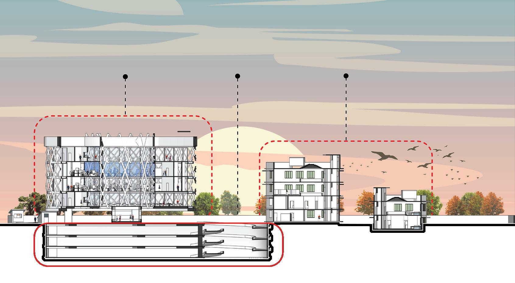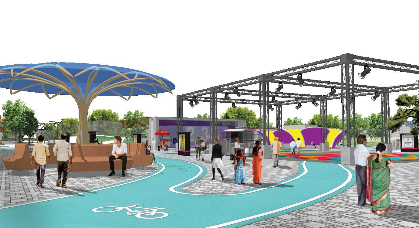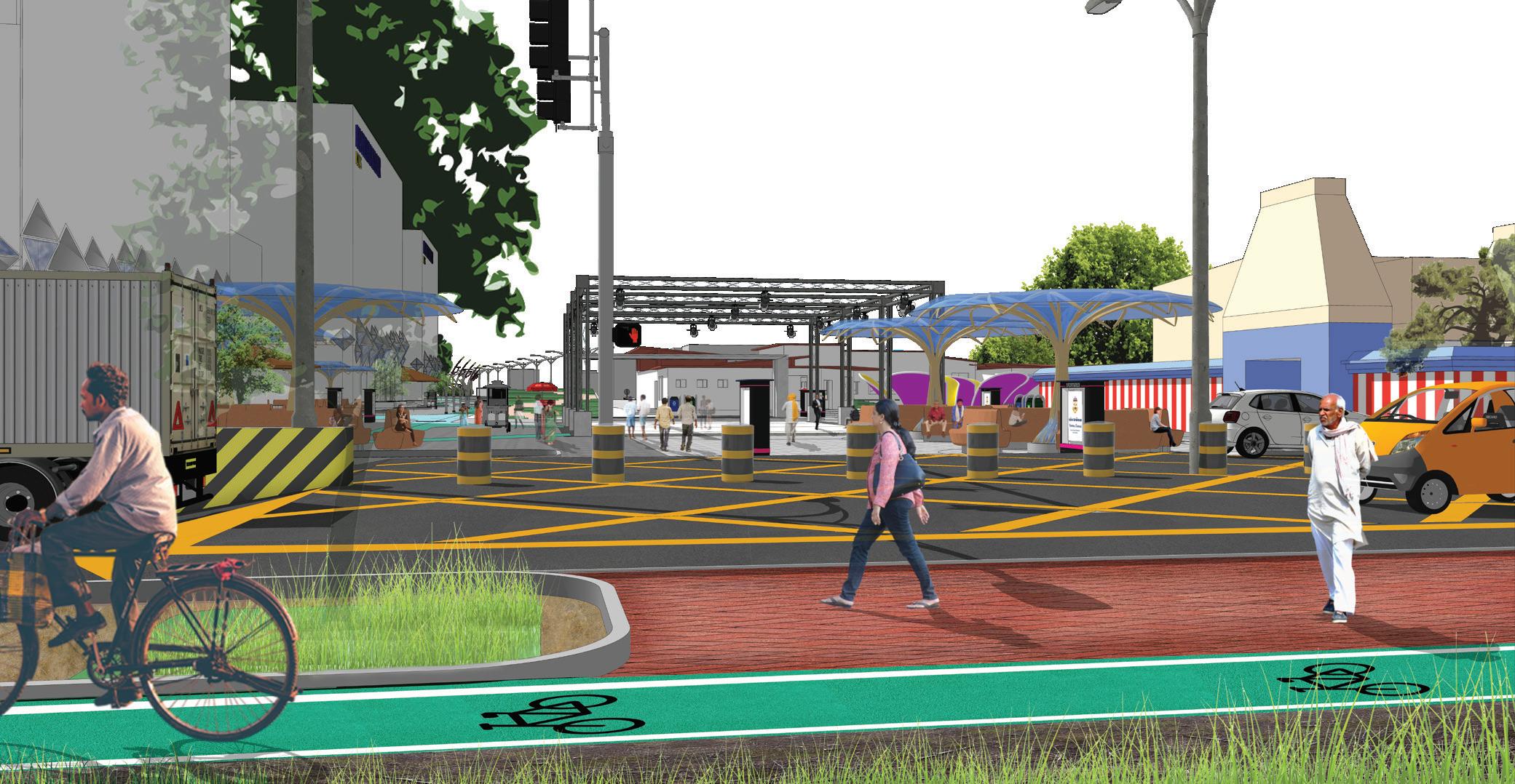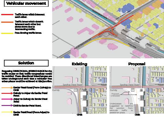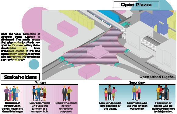 Social space intertwining with various modes of transport and enabling last mile connectivity. Taking the motorised transport lanes underground to enhancing the use of non motorised transport above ground thereby making the plaza pedestrian friendly.