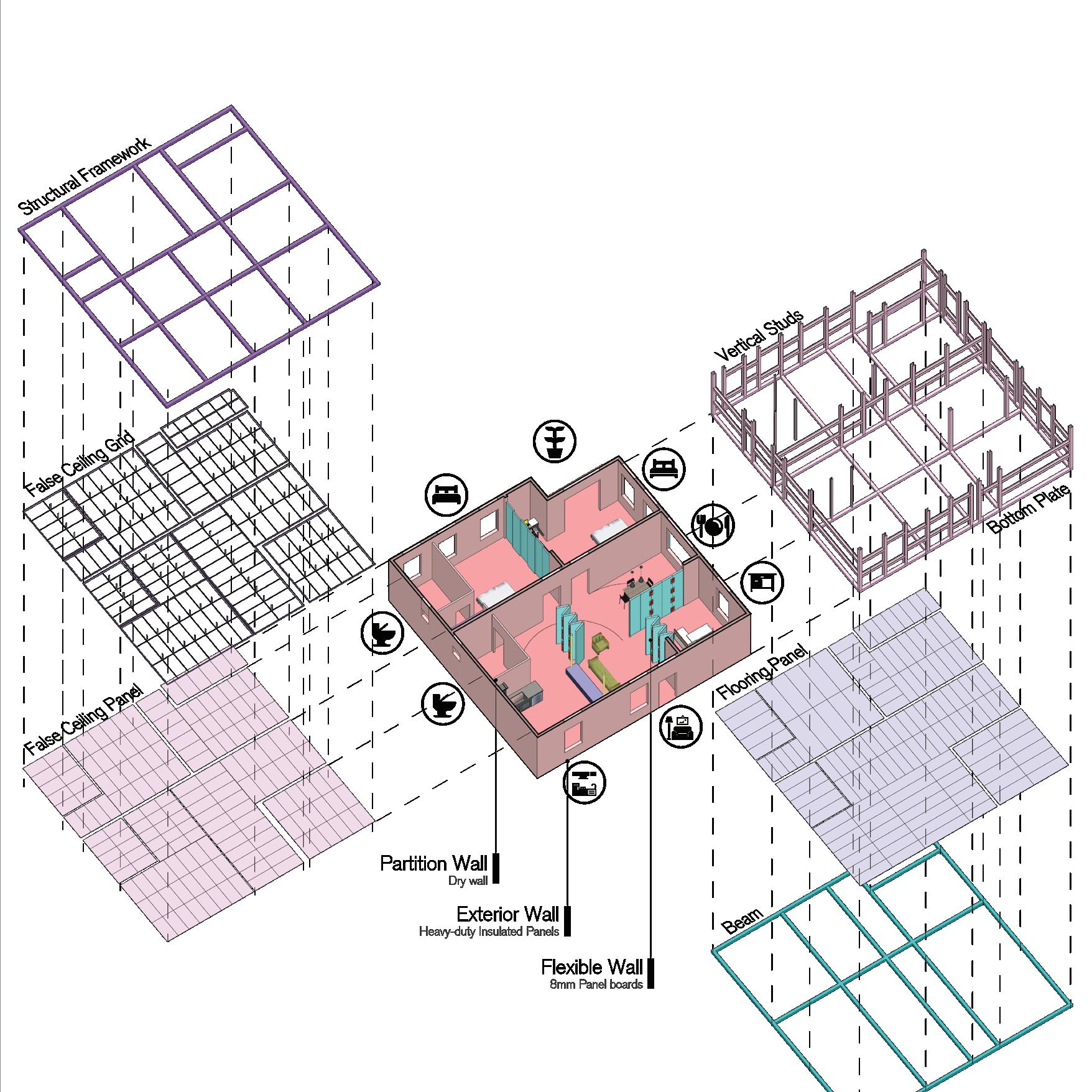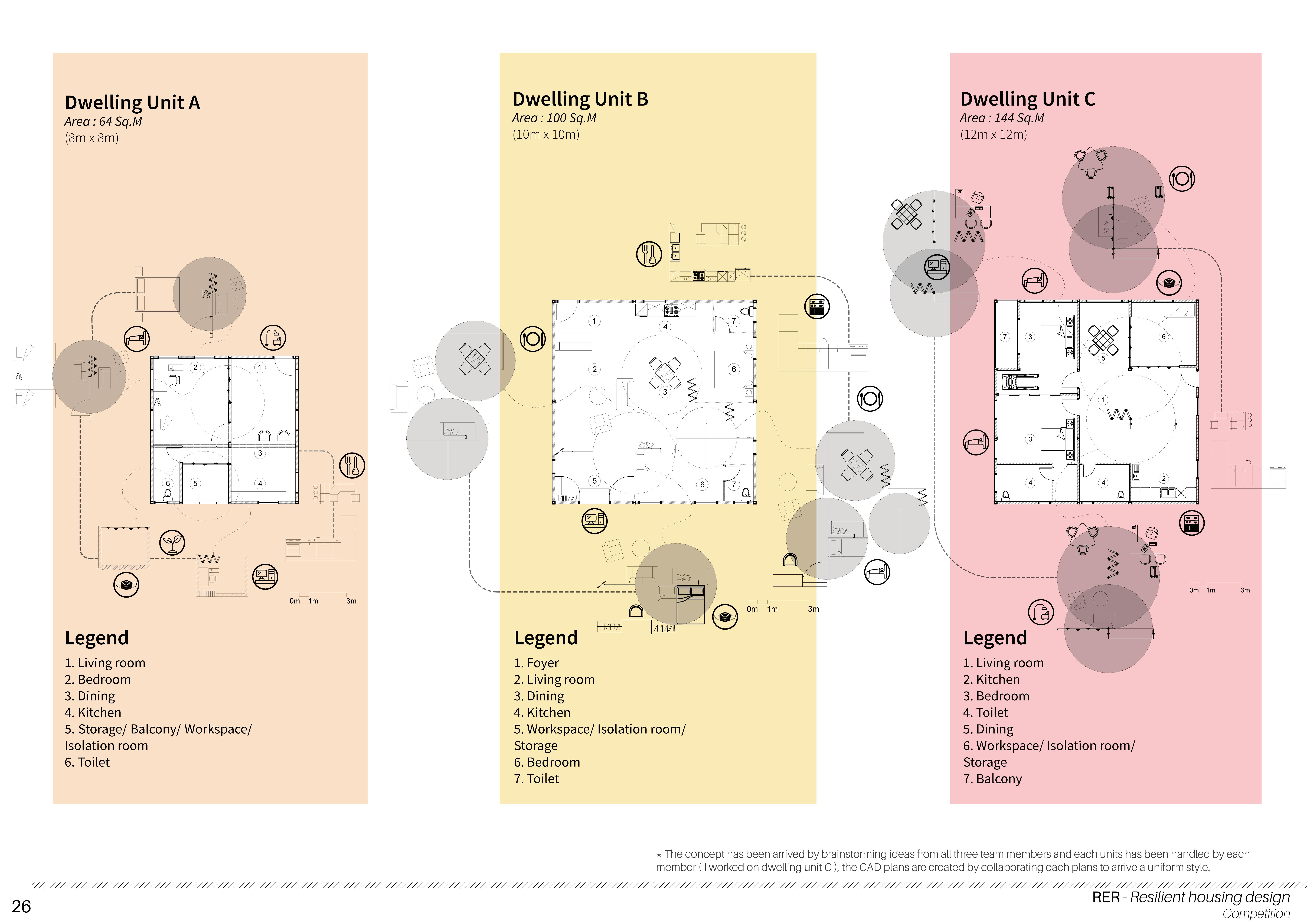 RER aims at create multi-functional residential spaces to incorporate work-from-home. Each nuclear family pods creates pockets that allows privacy and connection. We also adapted dry-wall construction techniques to reduce environmental impact during construction process, easy installation and mass production. Three modular Dwelling units A,B,C of area 64 sq.m, 100 sq.m, 144 sq.m are proposed.