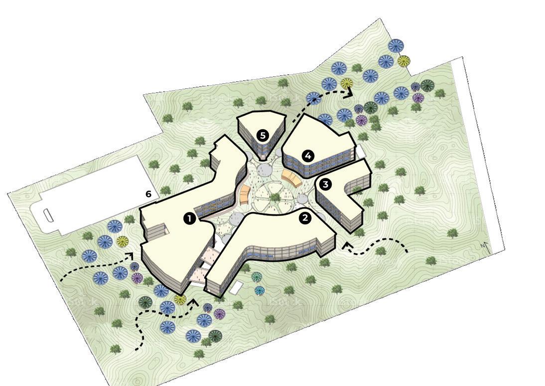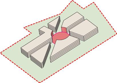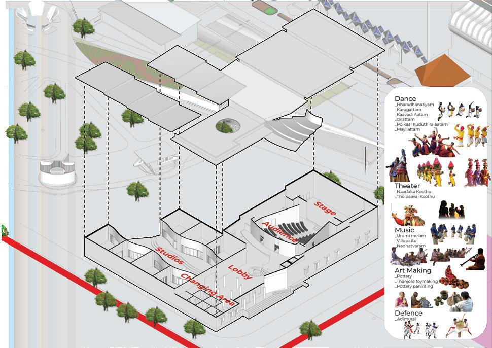 Enriching the plaza experience by changing the urban facade perceived by users to nature’s facade A performing arts center with indoor auditorium and studios Exhibition space for art and artistic works