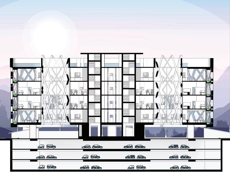 Greenery layer run along the circumference of the building acts as a secondary system which reduces the heat gain.