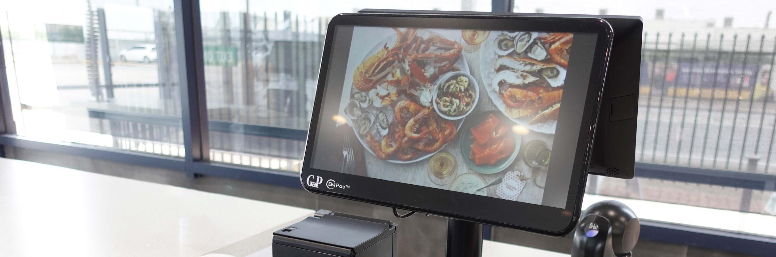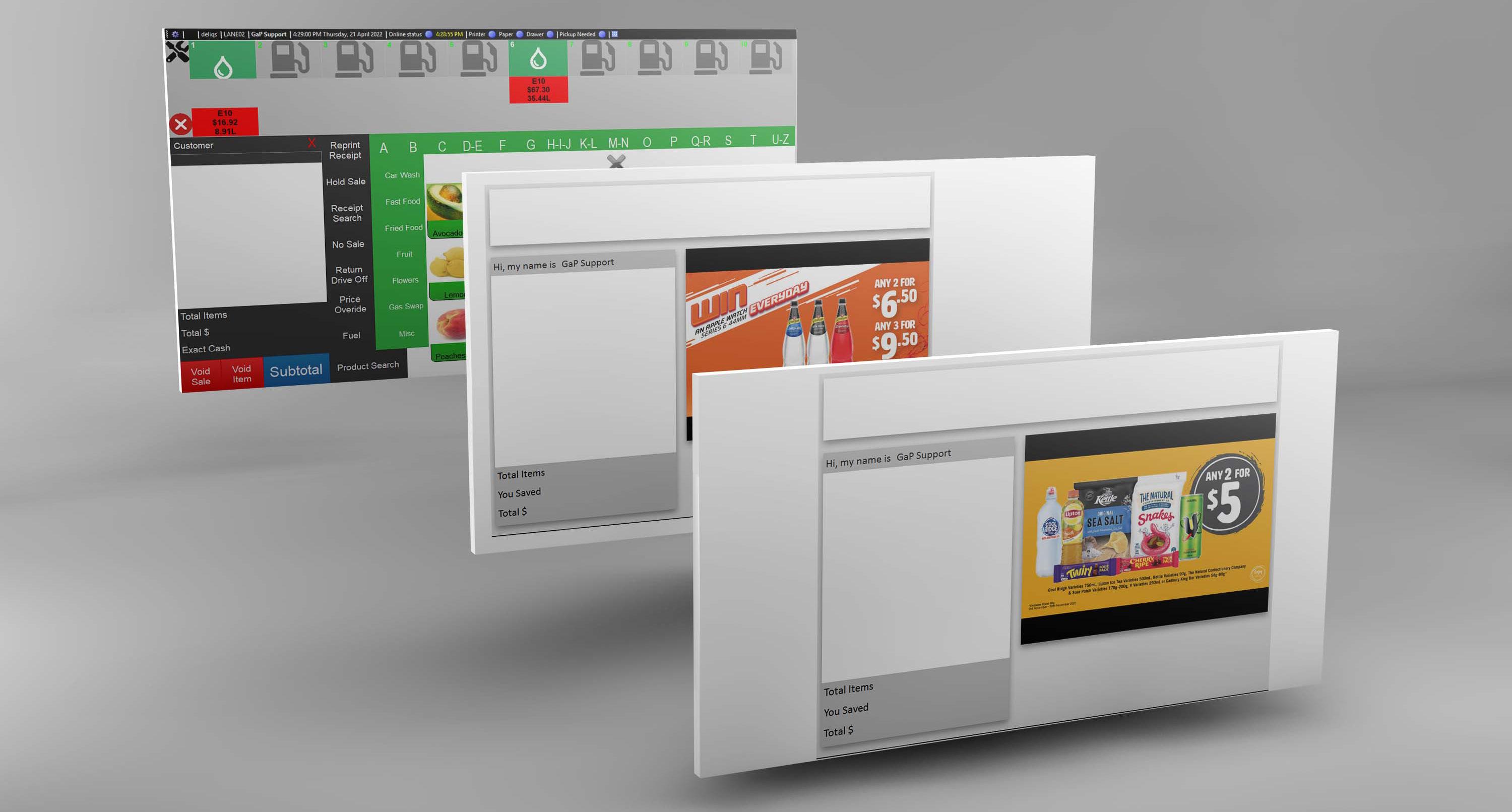Dual customer-facing screens. Running advertising and specials videos and animated GIFs while showing transaction process and totals for customer viewing pleasure.