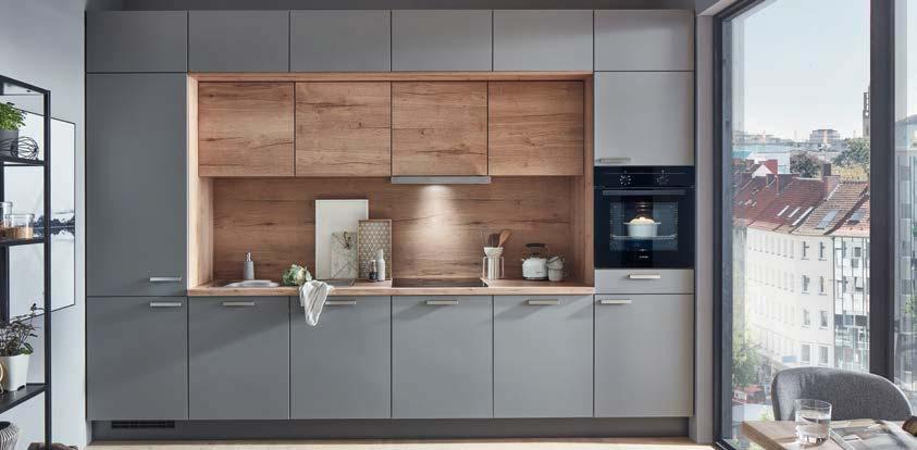 Zeilenküche Nobilia Easytouch / Structura, ca. 360 cm, Front: Lacklaminat, Taupegrau ultramatt / Eiche Sierra Nachbildung, Arbeitsplatte: Eiche Sierra Nachbildung