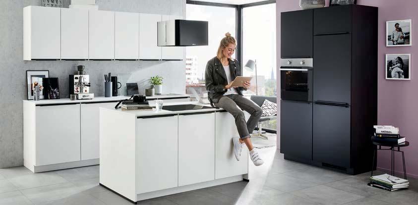 Küche in griffloser Optik Nobilia Fashion LineN, ca. 230 x 345 / 185 x 80 / 284 cm, Front: Lack, Alpinweiß matt, Arbeitsplatte: Schwarz strukturiert