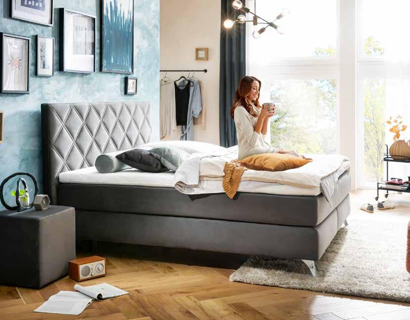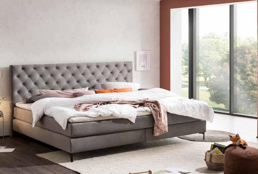 Elegant gepolstertes Kopfteil mit Keder-Einfassung und Karo-Steppung. Preisbeispiel für 500er TTFK-Matratzen mit 7-Zonen-Einteilung, wählbar in den Härtestufen Medium, Fest und Extra Fest. 20 cm hohe TTFK-Boxen, extra straff, in 7-Zonen-Unterteilung. Ausgestattet mit BasicKaltschaum-Topper, Bezugsstoff aus Stoffgruppe 1 Liegefläche180/200 cm. ohne elektrische Verstellung