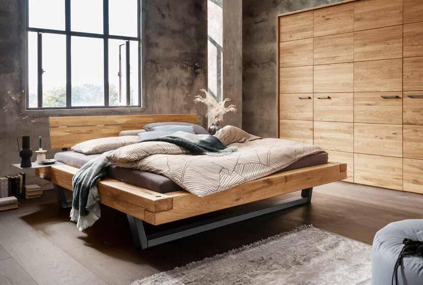 Dieses rustikale Balkenbett aus massiver Wildeiche macht Ihr Schlafzimmer zu einem natürlichen Ruhepol. Die wertigen Kufenfüße aus Edelstahl verleihen dem Bett eine schwebende Optik.