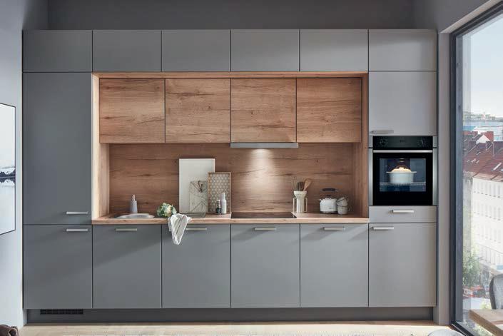 ZEILENKÜCHE NOBILIA EASYTOUCH / STRUCTURA ca. 360 cm, Front: Lacklaminat, Taupegrau ultramatt / Eiche Sierra Nachbildung, Arbeitsplatte: Eiche Sierra Nachbildung