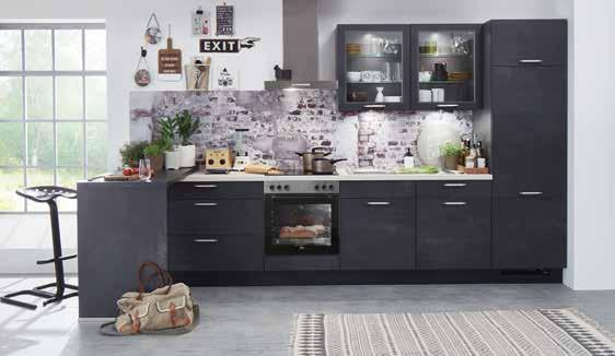 KÜCHENZEILE NOBILIA SPEED ca. 360 cm, Front: Schwarzbeton Nachbil dung, Arbeitsplatte: Travertin sandbeige Nachbildung / Schwarzbeton Nachbil dung