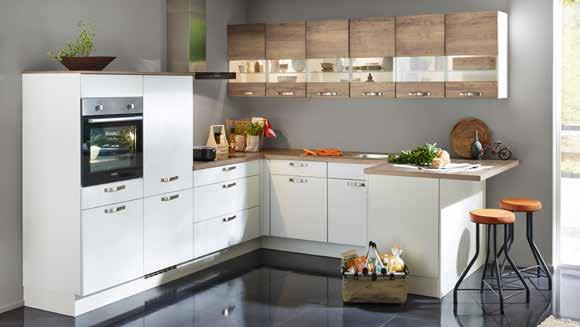 WINKELKÜCHE NOBILIA CHALET ca. 245 x 405 cm, Front: Lack, Magnolia matt, Arbeitsplatte: Stammeiche Nachbildung