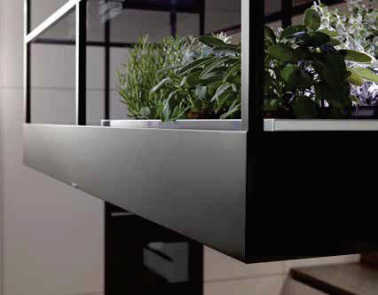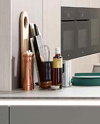 Funktionale Details wie ein Paneelsystem für Kochutensilien und eine Inselhaube mit integrierten Staumöglichkeiten ergänzen das Design. Hochwertige Materialien wie melaminbeschichtete Kunststoff- und gebürstete Holzfronten bieten Langlebigkeit und eine angenehme Haptik. Hinzu kommen Vollauszüge mit Glas-Seiten und eine LED-Nischenbeleuchtung, die für hohen Komfort und eine elegante Optik sorgen.
