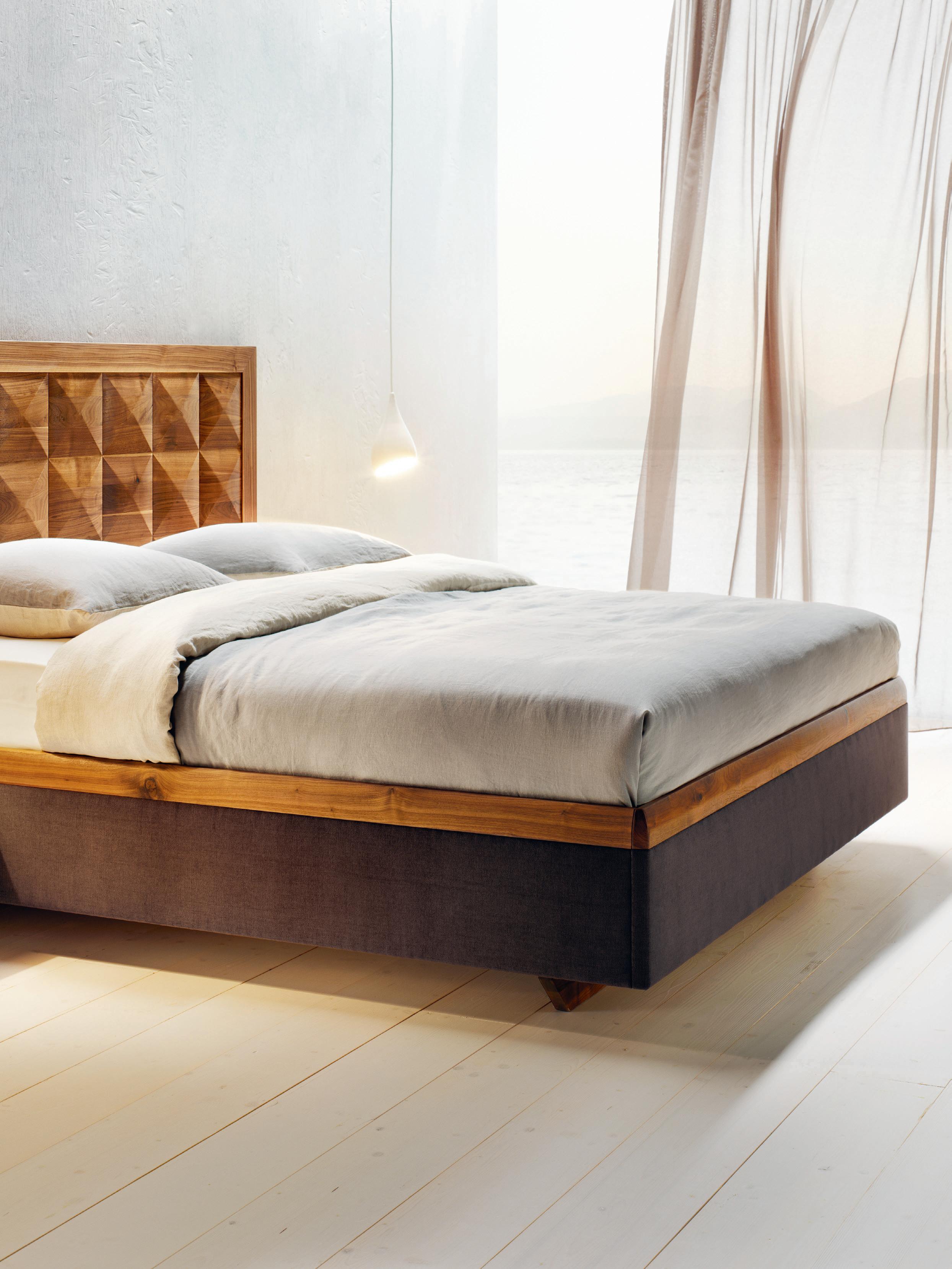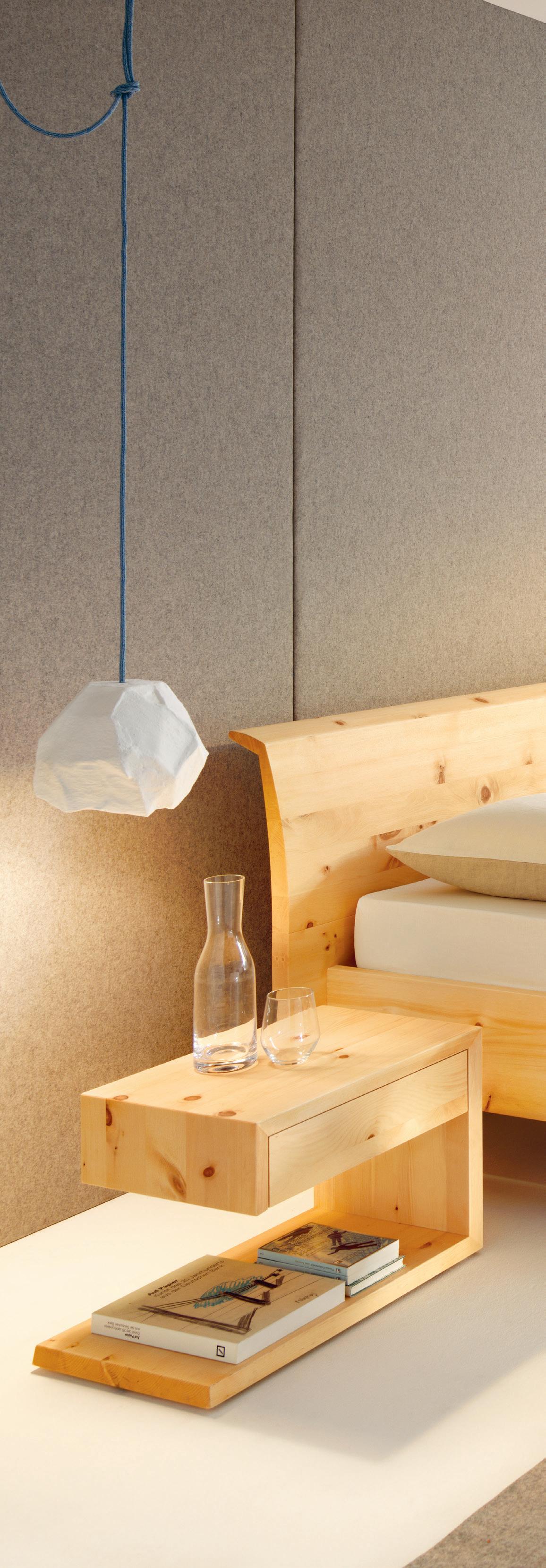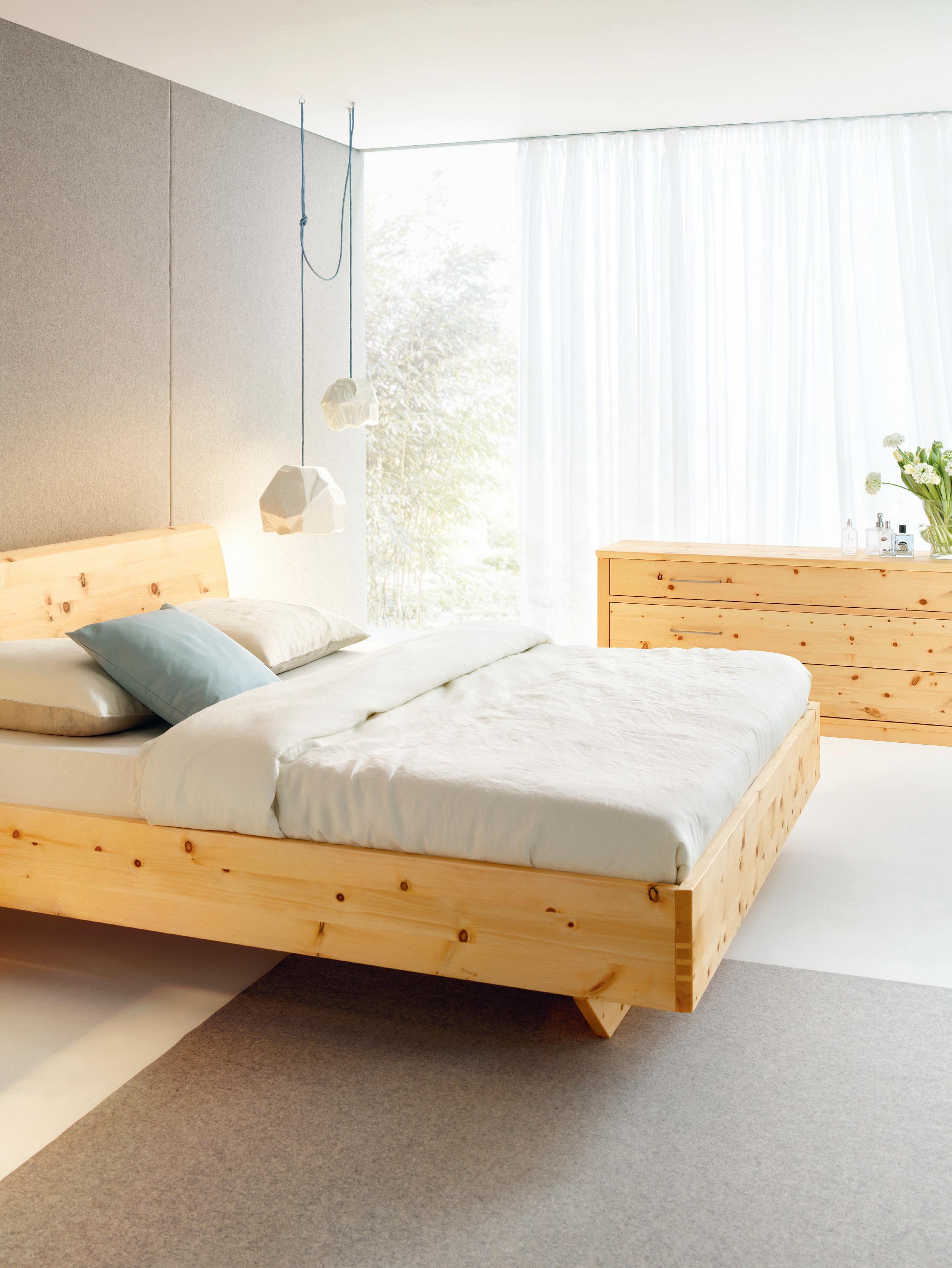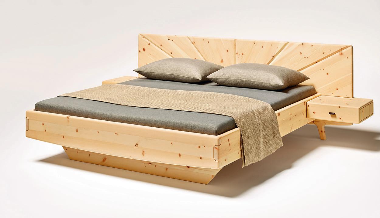 Zurückhaltung ist ihre Stärke nicht. Imposant steht dieses Bett im Raum, die Prismen im Haupt verstärken diesen Eindruck noch. Gleichzeitig vergrößern sie die Oberfläche – in der Zirbenholzvariante ein maximales Dufterlebnis!