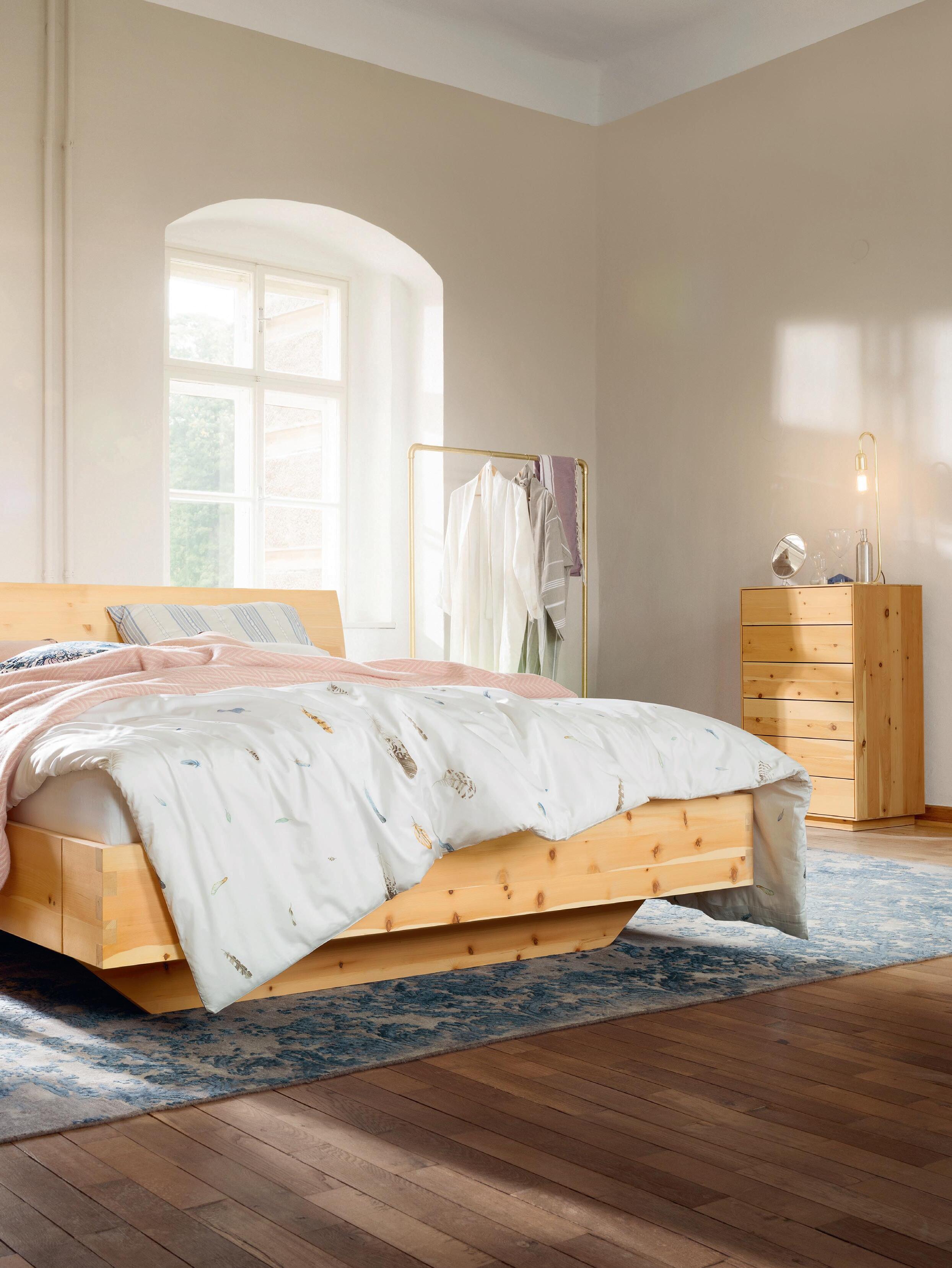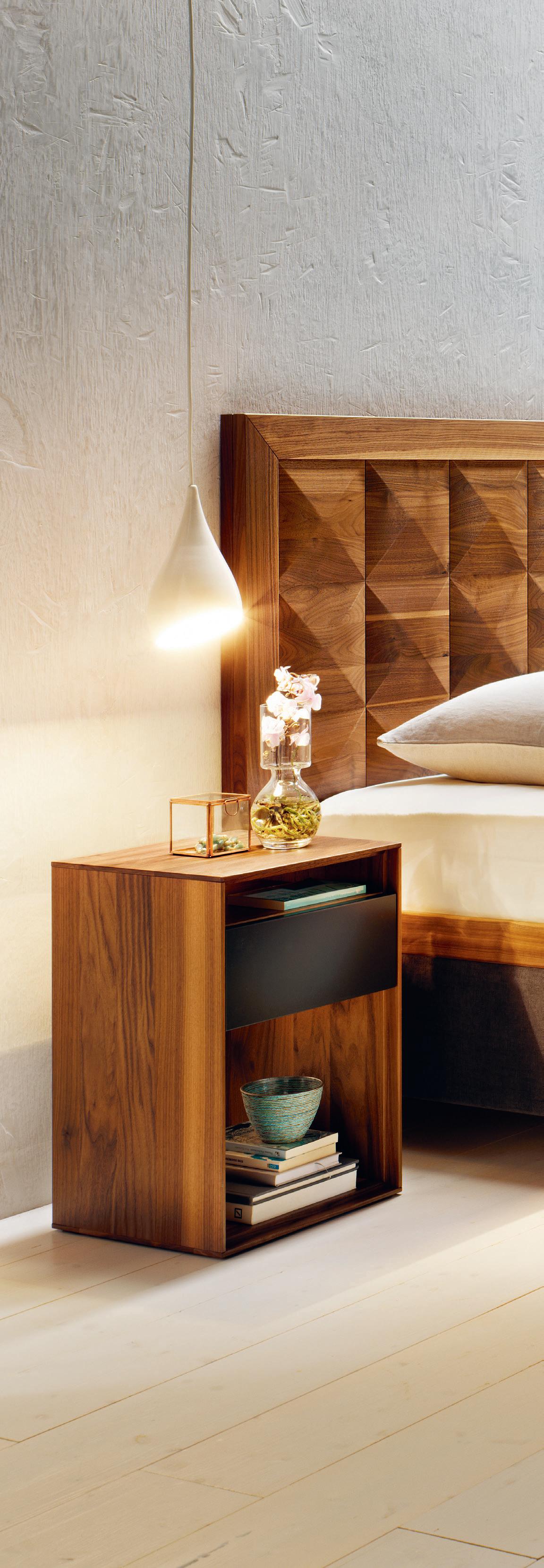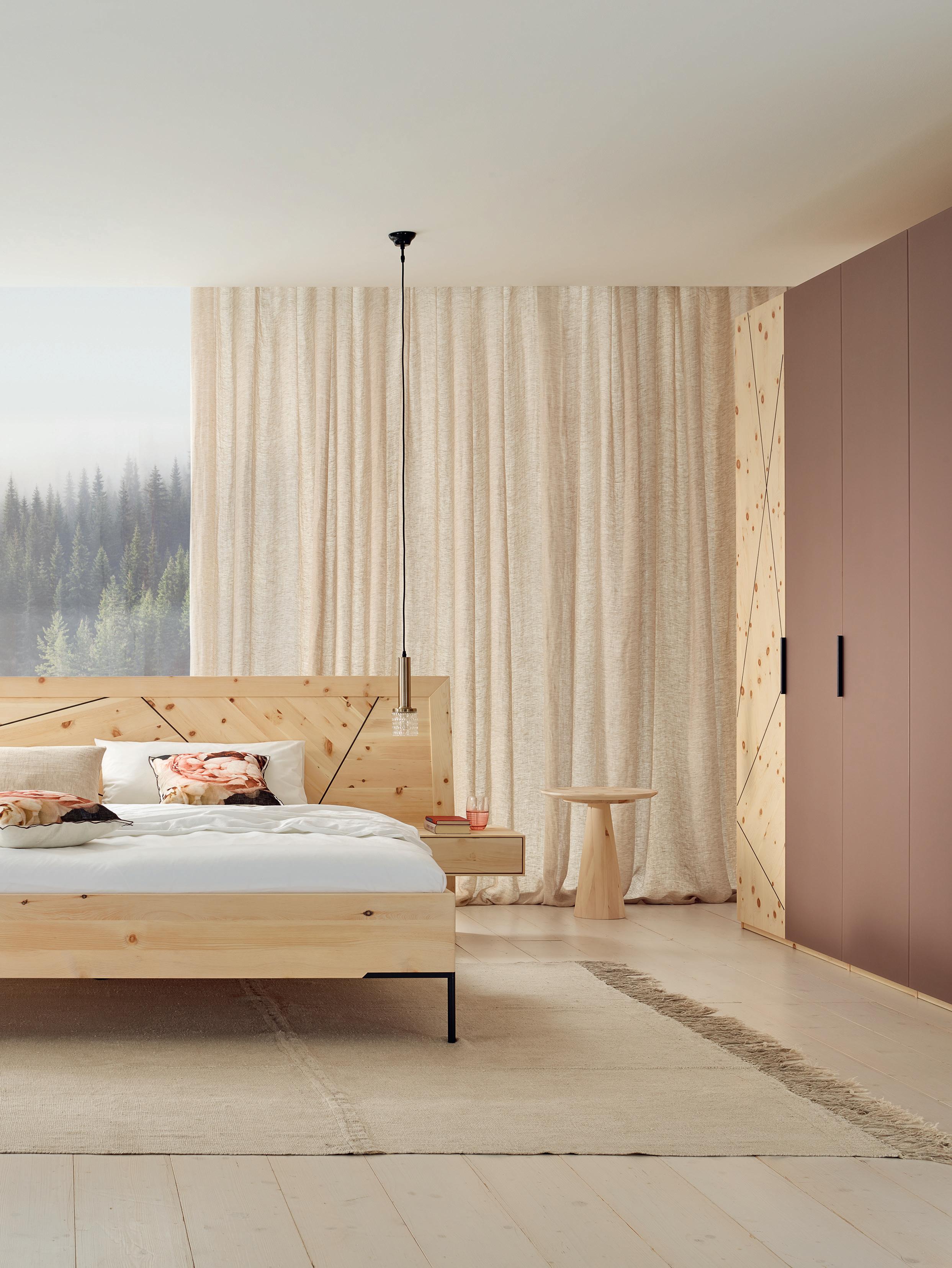 Zurückhaltung ist ihre Stärke nicht. Imposant steht dieses Bett im Raum, die Prismen im Haupt verstärken diesen Eindruck noch. Gleichzeitig vergrößern sie die Oberfläche – in der Zirbenholzvariante ein maximales Dufterlebnis!