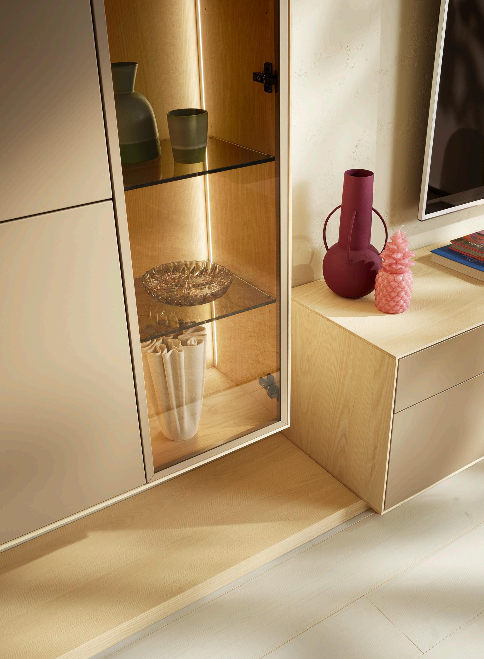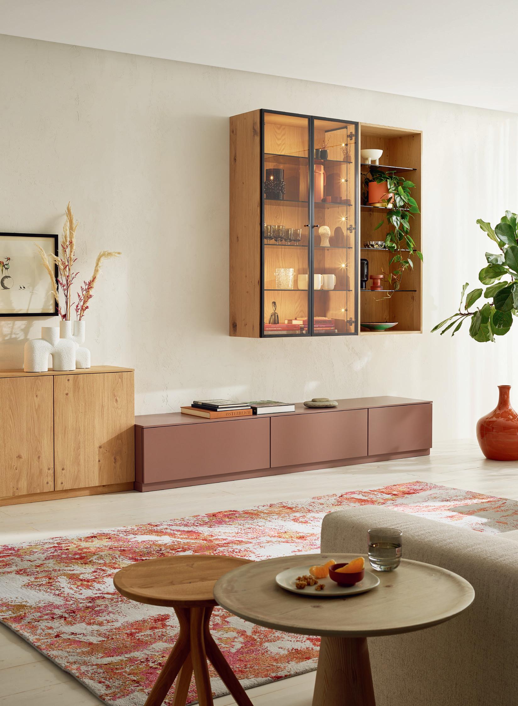Schrankkombination ruum, Glasfront lichtgrau, Designelement Astnuss natur geölt
