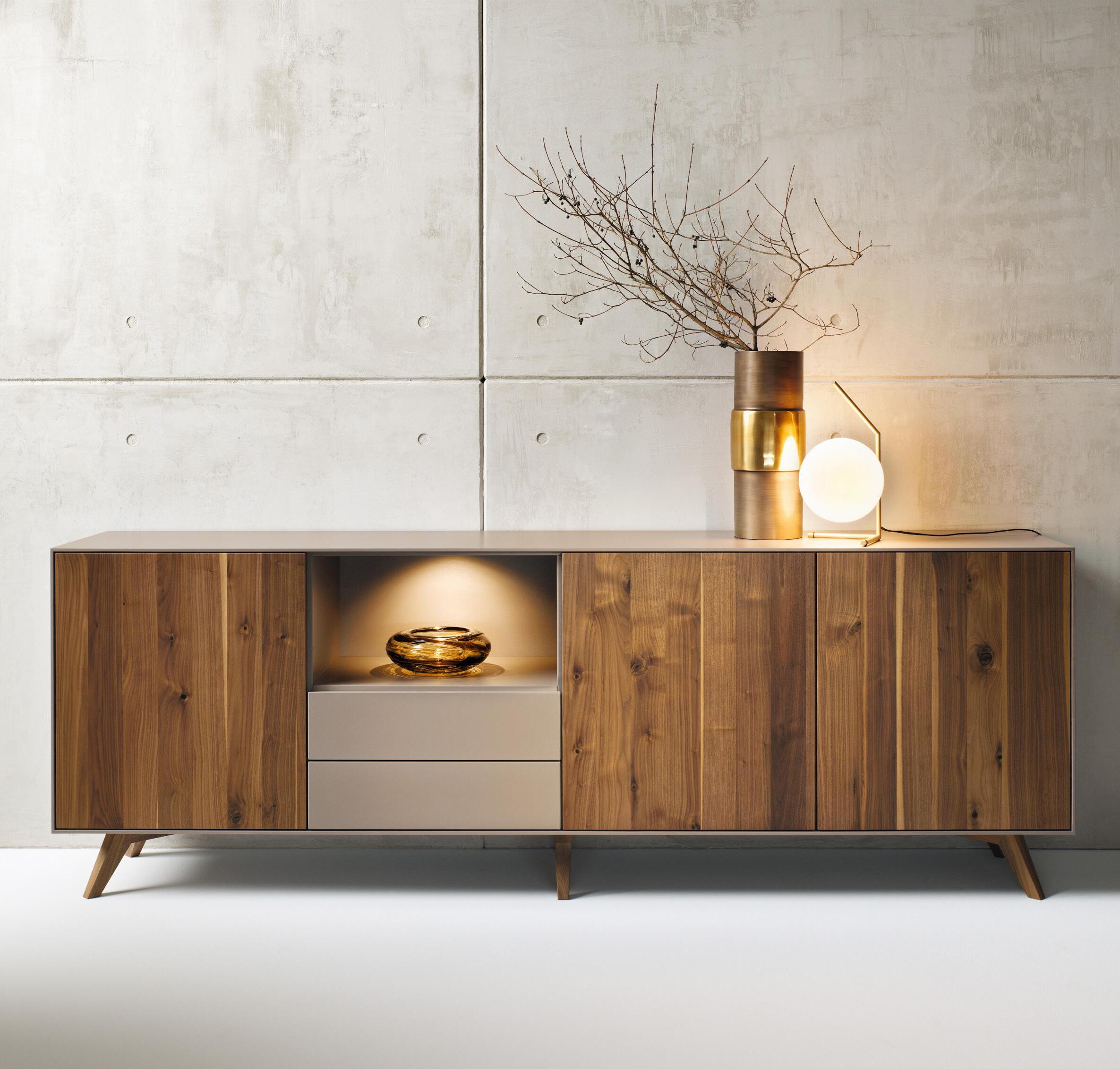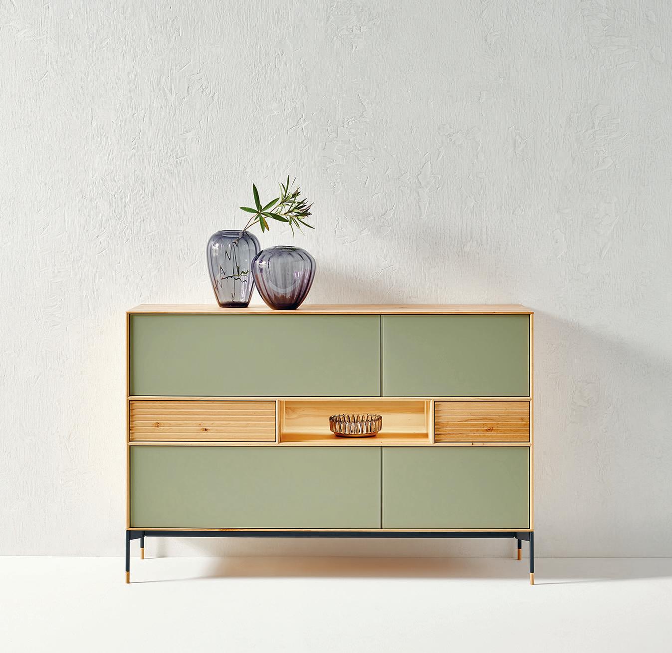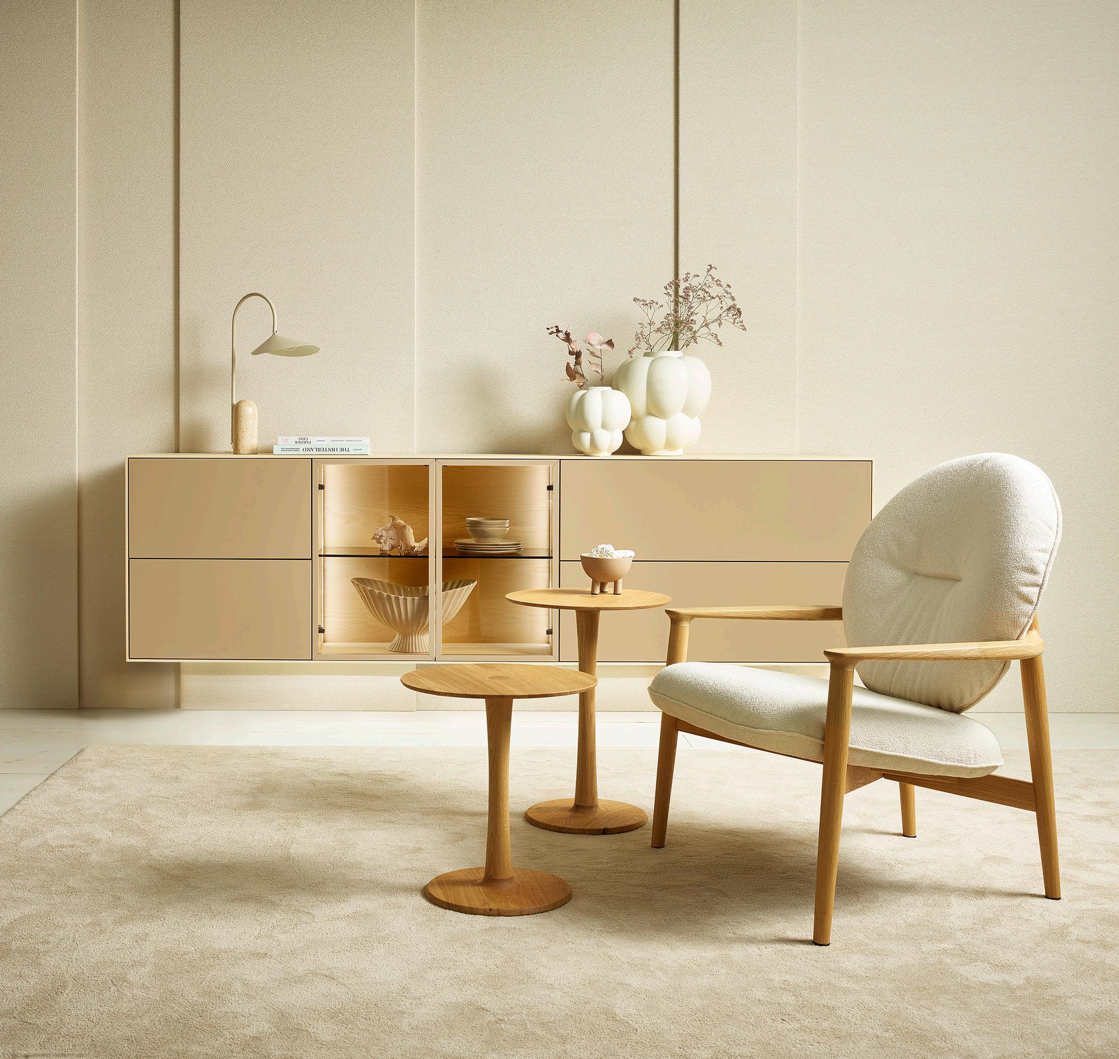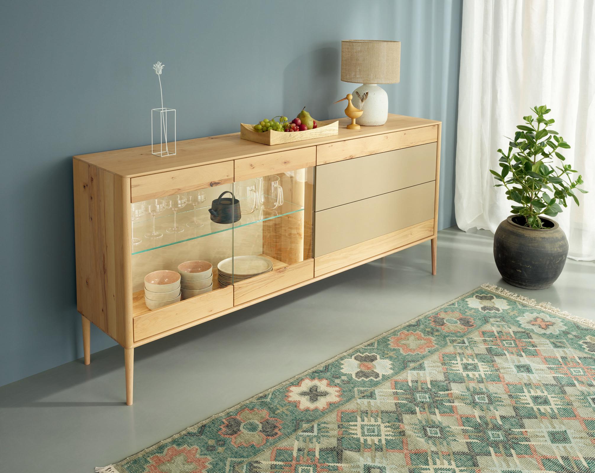 juna Sideboard 87, Naturbuche gebürstet, hell geölt, kombiniert mit Lackfronten sand, Rückwand in Lack sand