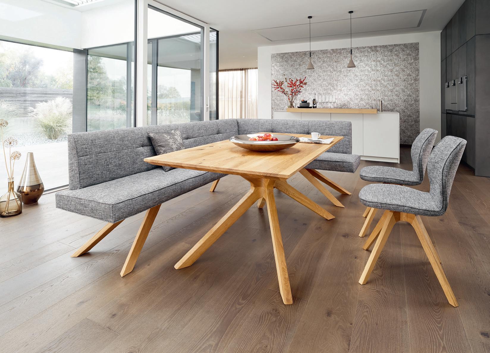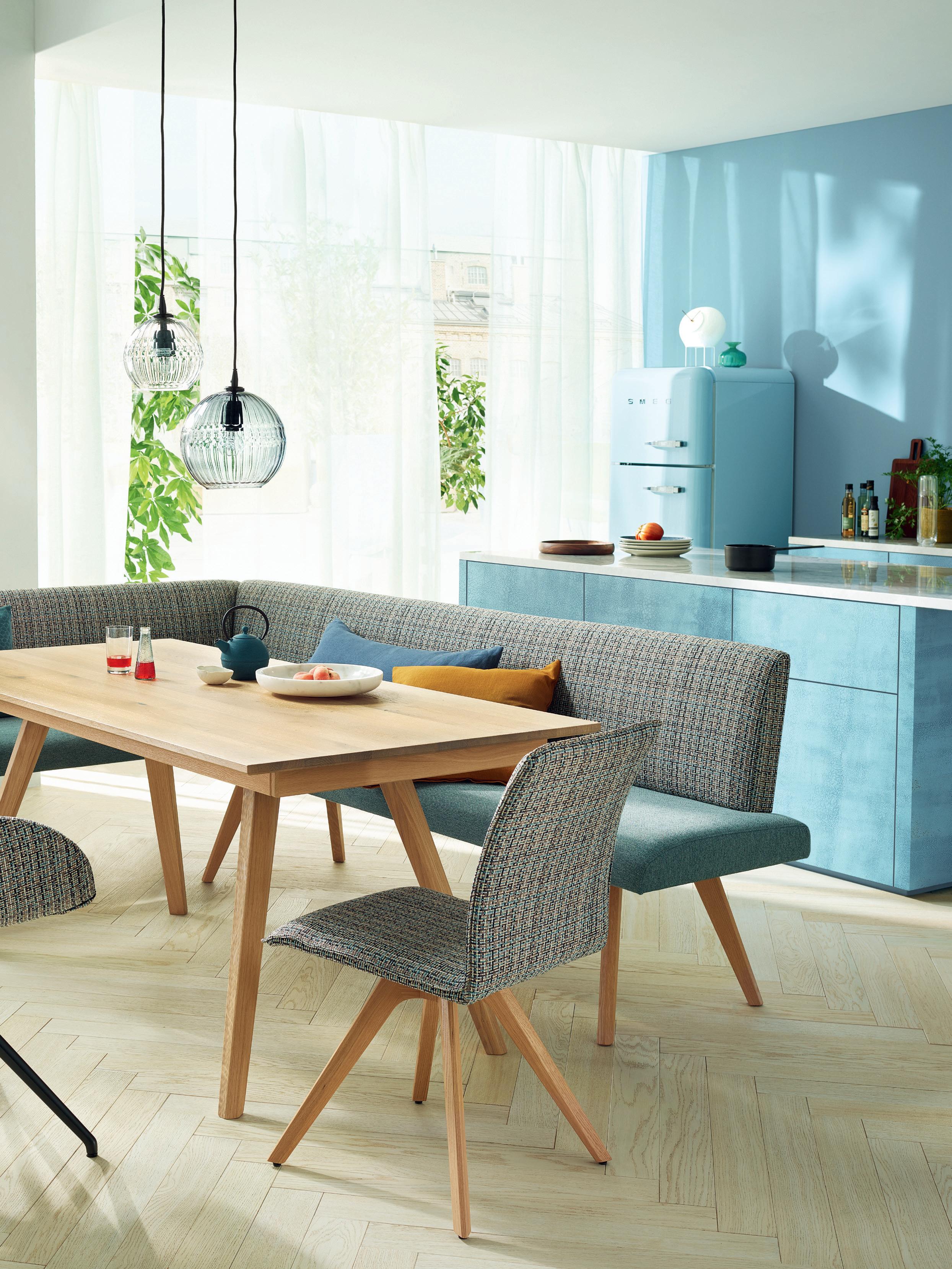 juna Speisezimmer, Naturbuche gebürstet, hell geölt, 4-Fußtisch ohne Fußsteg, Eckbank JB, Rückenpolster und Stuhl 637 in Stoff II/Q248