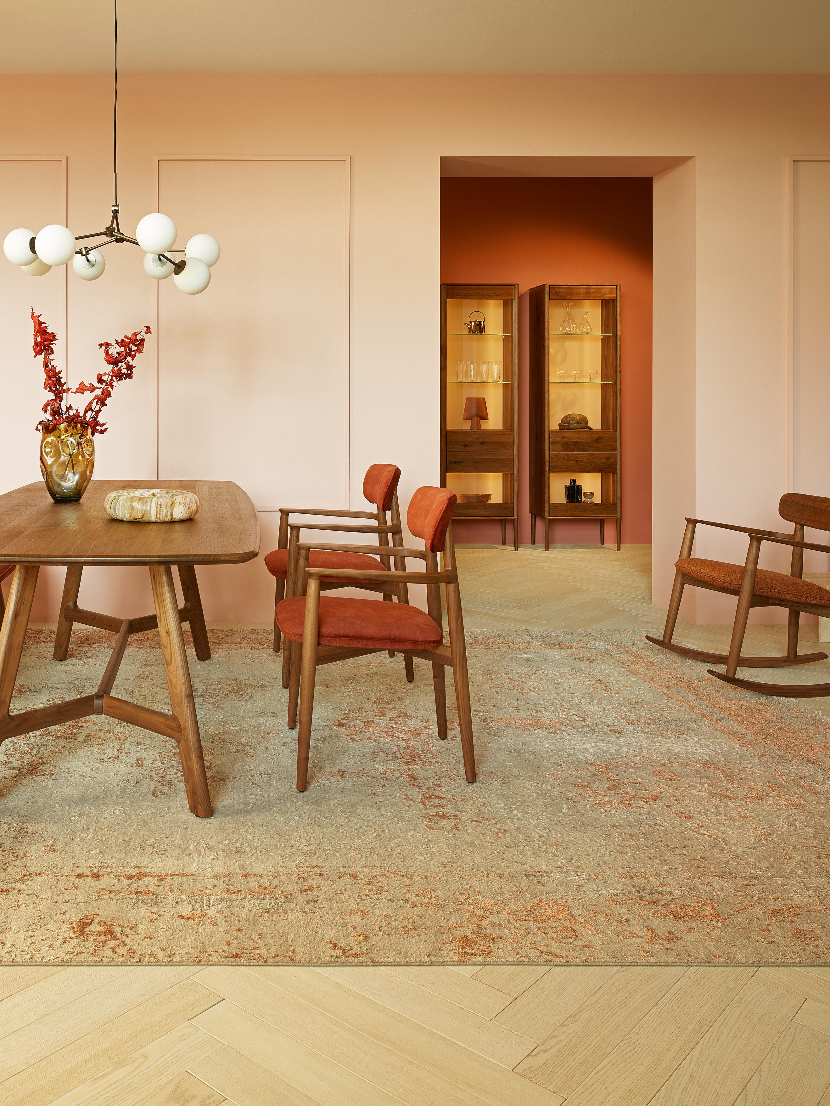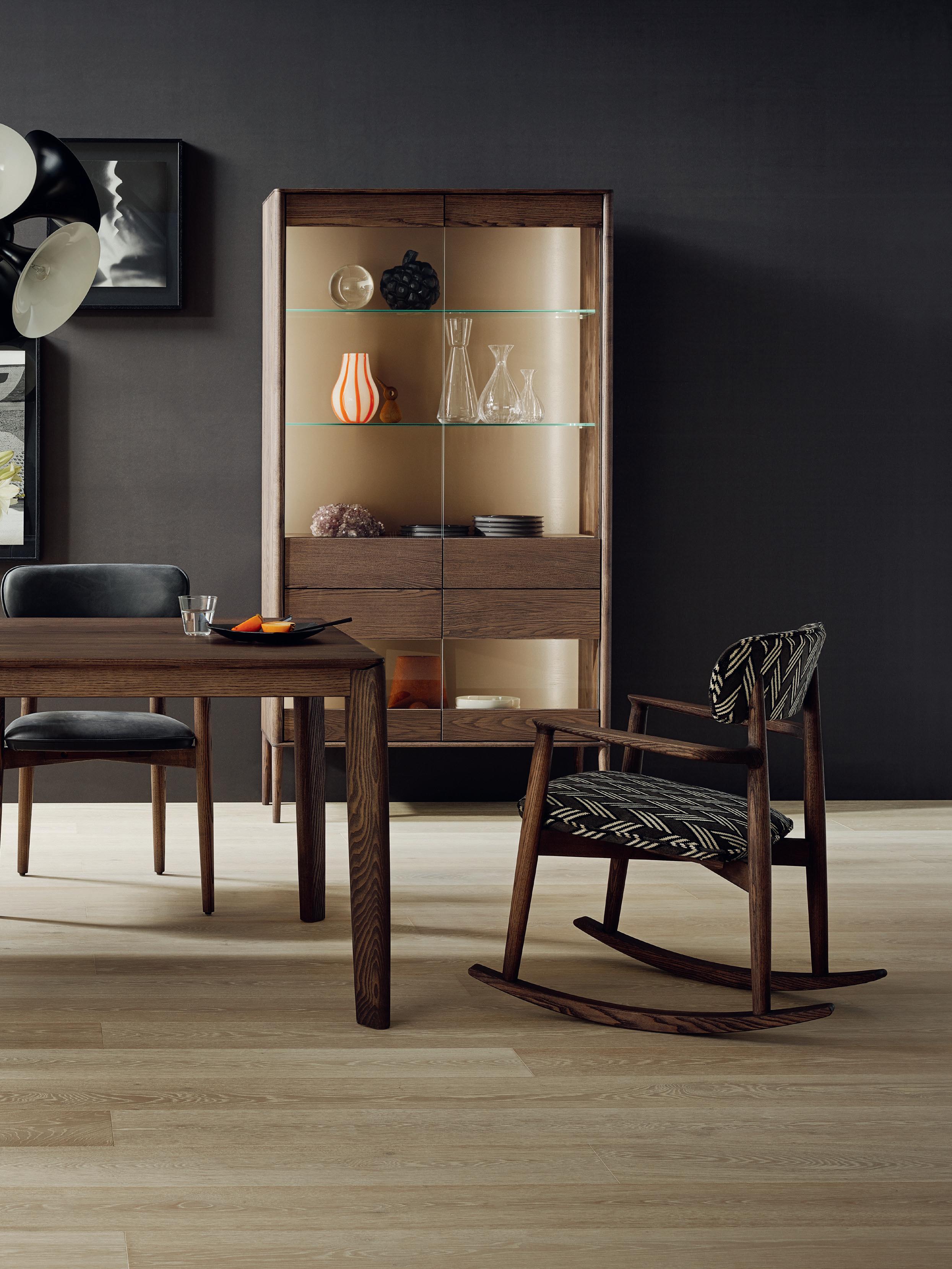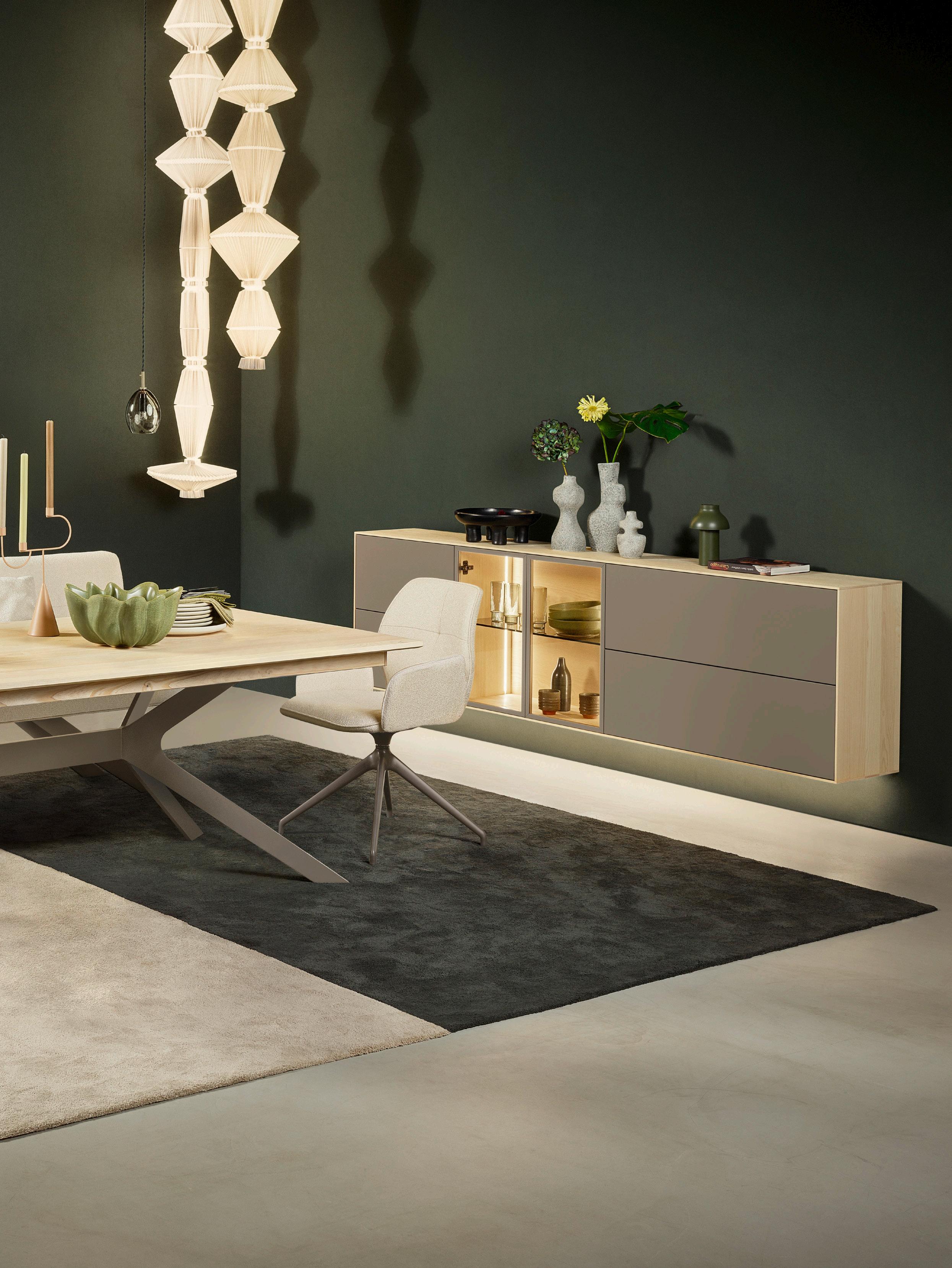 juna Speisezimmer, Esche gebürstet, tabak geölt, Ausziehtisch K mit außenliegenden Füßen, Stühle 637 in Leder Nubuk black, Schaukelstuhl 638 in Beistellstoff, Vitrine 62 Rückwand in Lack sand