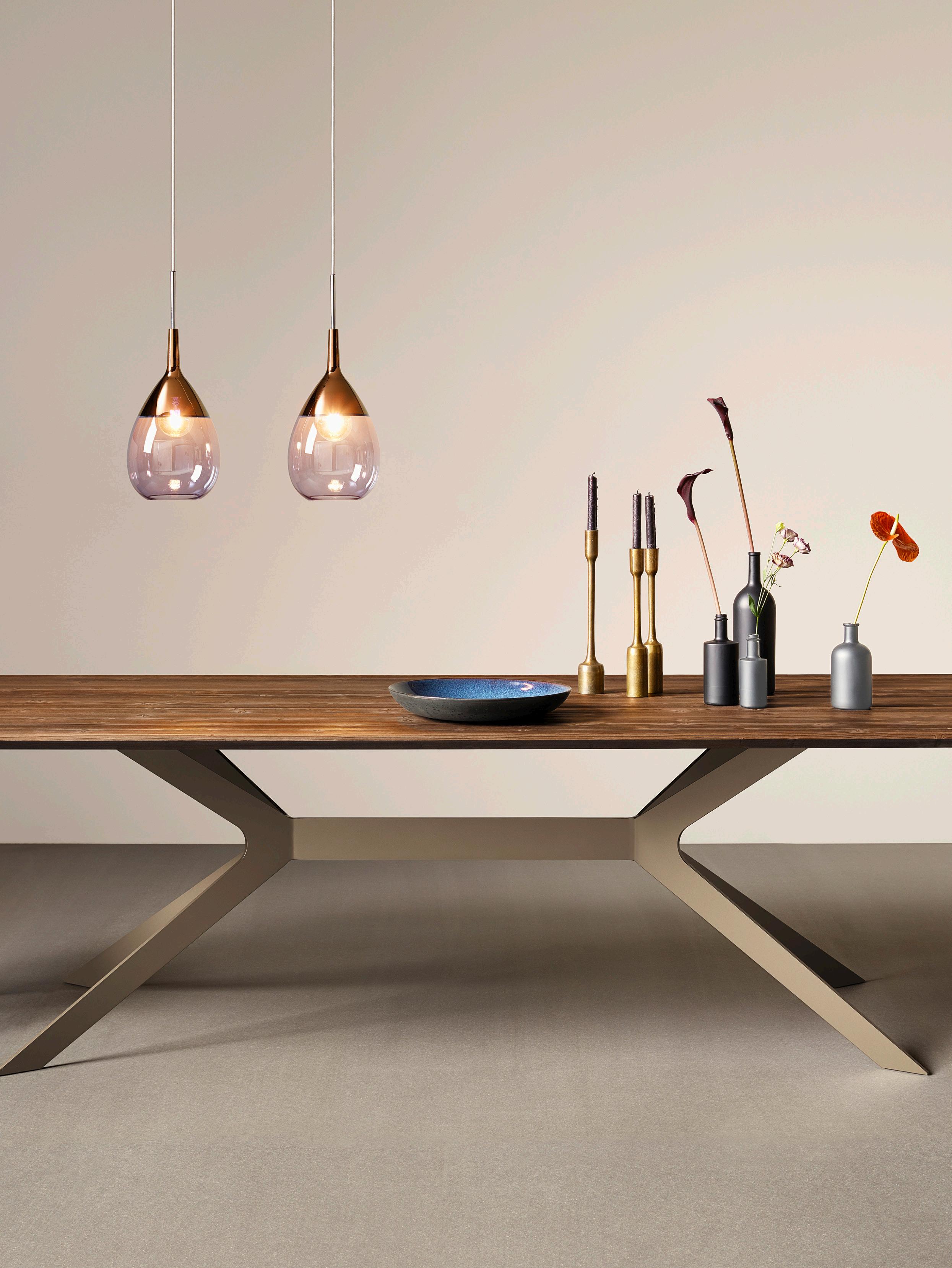 Zusammenhalt ist das zentrale Element der Linie Gino. Die tragenden Vertikalen wachsen scheinbar mühelos empor, wie die Äste eines Baumes. Facettierte Kanten geben Gestell und Platte formschöne Konturen und sind ein haptisches Vergnügen.
