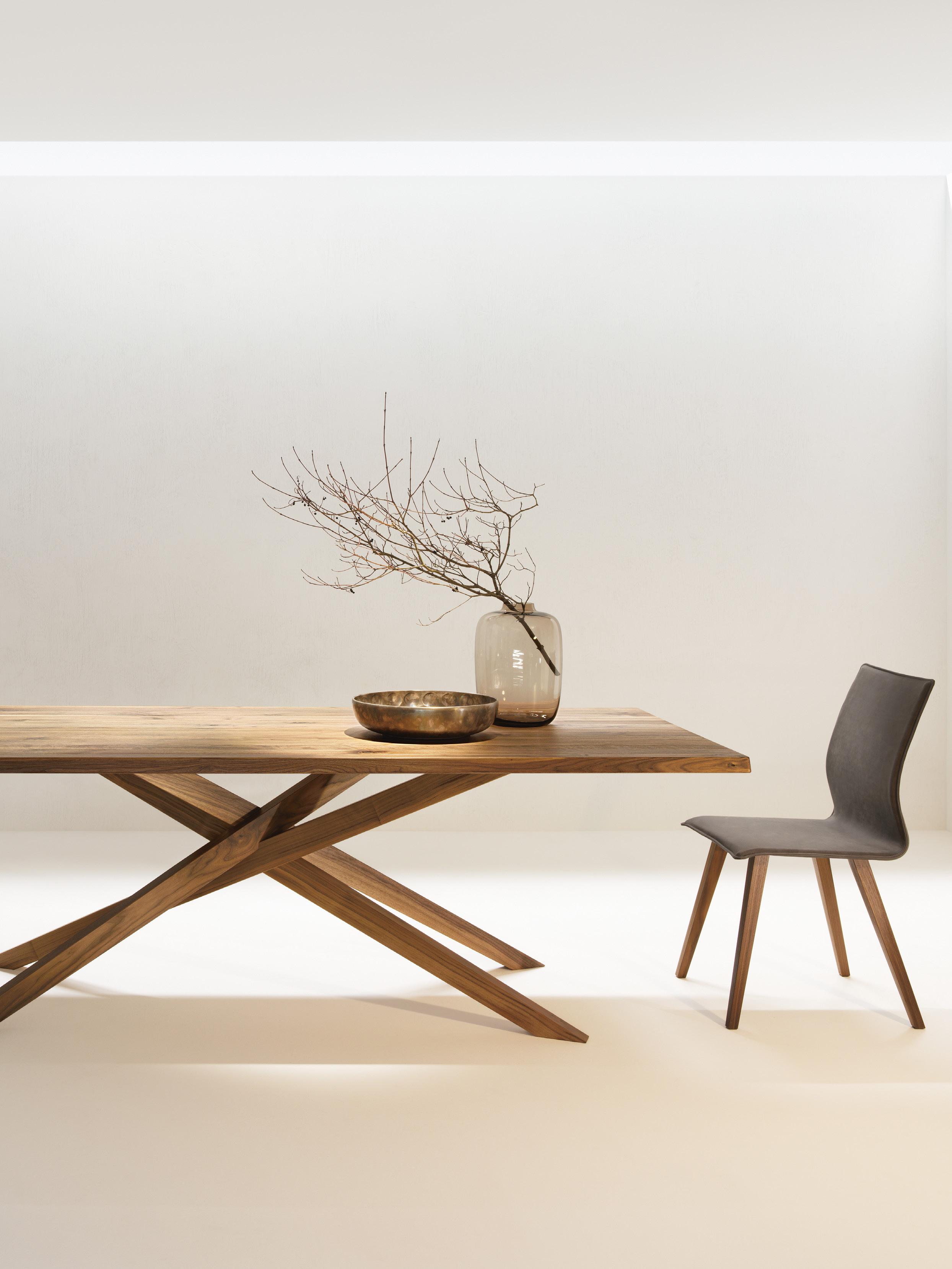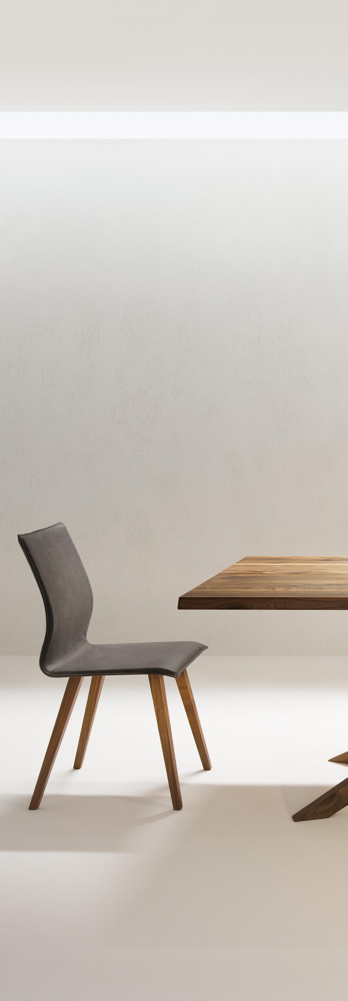 Bei den Stühlen setzt sich die jeweilige Holzart des Tisches fort – Formschluss und Verbundenheit, handwerklich meisterhaft umgesetzt.