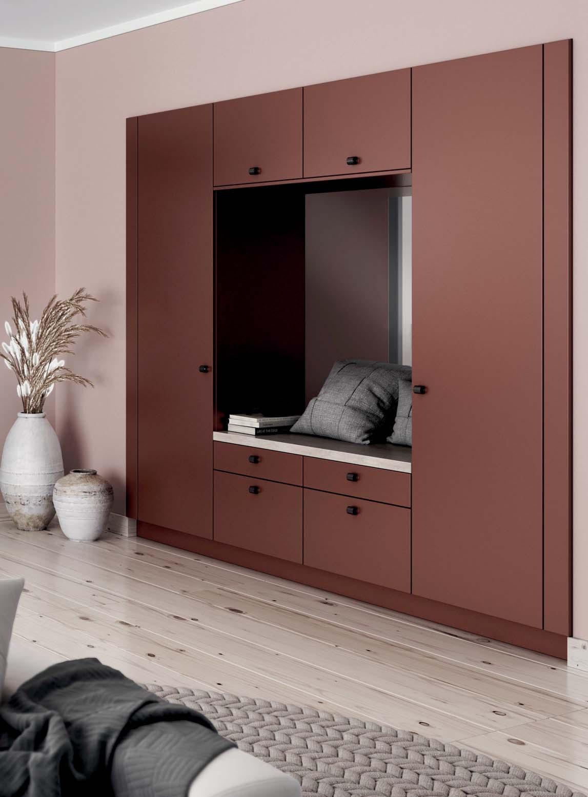 Im Bild zu sehen: Front: Baku 253 Acai seidenmatt, Arbeitsplatte: 965 Quarz Rose, Griff: 316 edelstahlfarbig mit Lederlasche
