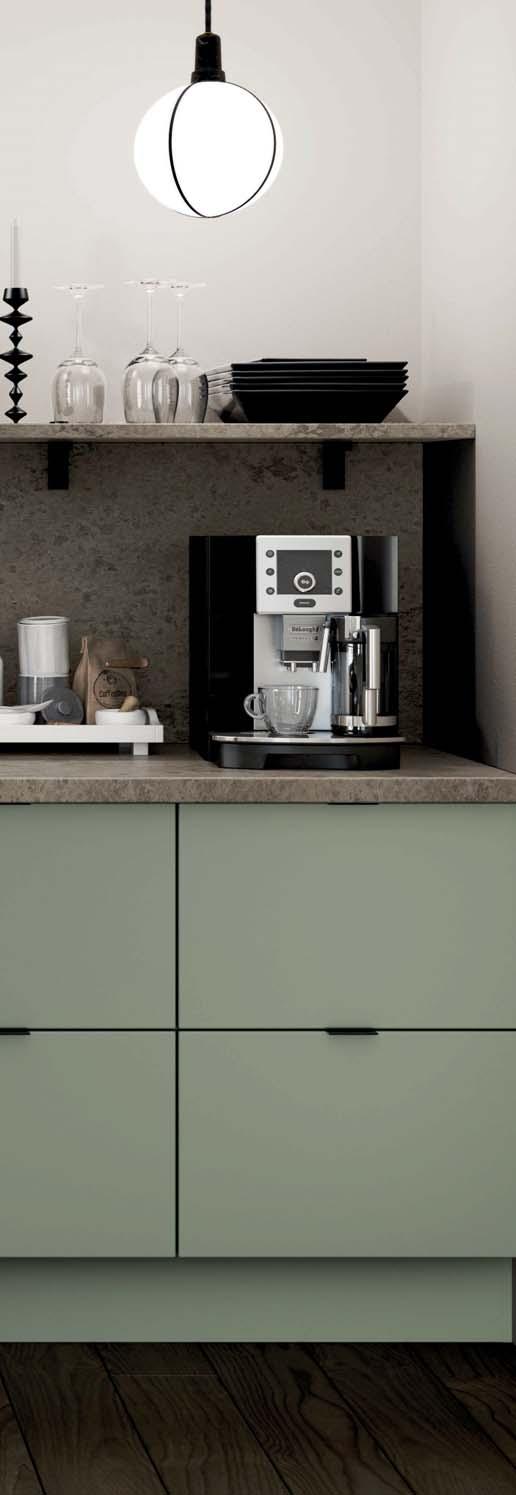 Im Bild zu sehen: Front: Cindy 237 Salbei seidenmatt, Arbeitsplatte: Elegant brown 956, Griff: 316 edelstahlfarbig mit Lederlasche
