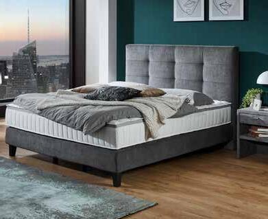 Boxspringbett in der Größe 180 x 200 cm bestehend aus gepolstertem Kopfteil CHICAGO, zwei 26 cm hohen Taschenfederkern-Unterfederungen mit schwebendem Fuß, zwei mit Möbelstoff bezogenen 7-Zonen-TonnenTaschenfederkernmatratzen mit 500 Federn (bei 100 x 200 cm) und ein softiger, 5 cm hoher durchgängiger Komfortschaum-Topper.