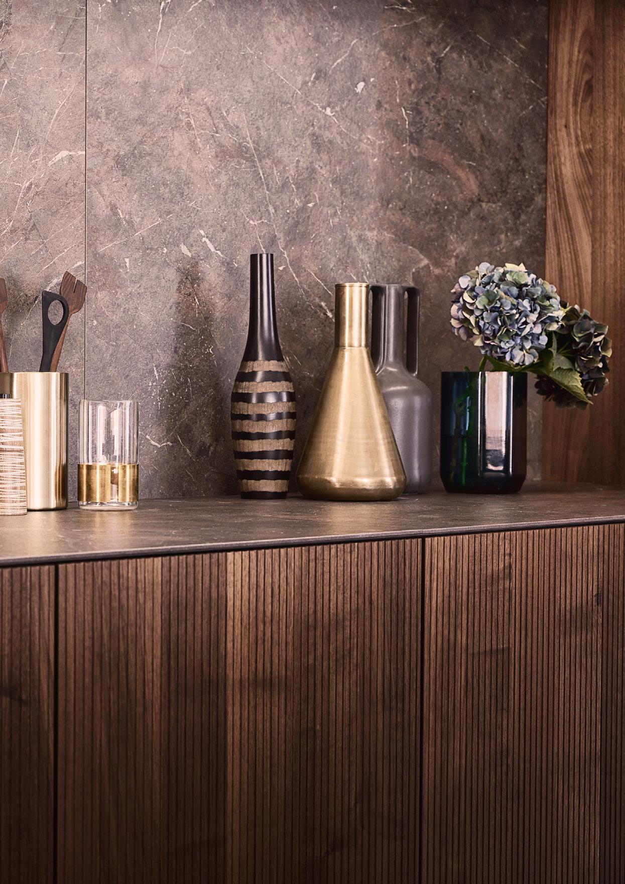 Das zweite Material dieser Küchenplanung, eine auf Gehrung gearbeitete Keramik kommt in Verbindung mit dem dunklen Walnussholz perfekt zur Geltung. Der freistehende, der Küchenzeile vorgelagerte Inselblock sowie die Arbeitsplatten sind ebenfalls aus dieser hochwertigen Keramik gefertigt – sie unterstreichen den mondänen, luxuriösen Look der außergewöhnlichen Küche.