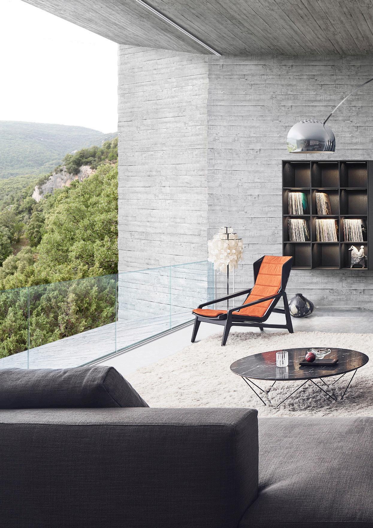 Como perfecta prolongación de la zona de la cocina, la sala de estar se funde visual y funcionalmente con el ambiente. Un elemento formado por estantes y armarios abiertos y cerrados se utiliza como hábil separador arquitectónico de los espacios: al crear ejes visuales entre ambas zonas sin desvelar la intimidad de sus ocupantes, este elemento establece un nexo comunicativo entre ambos puntos.