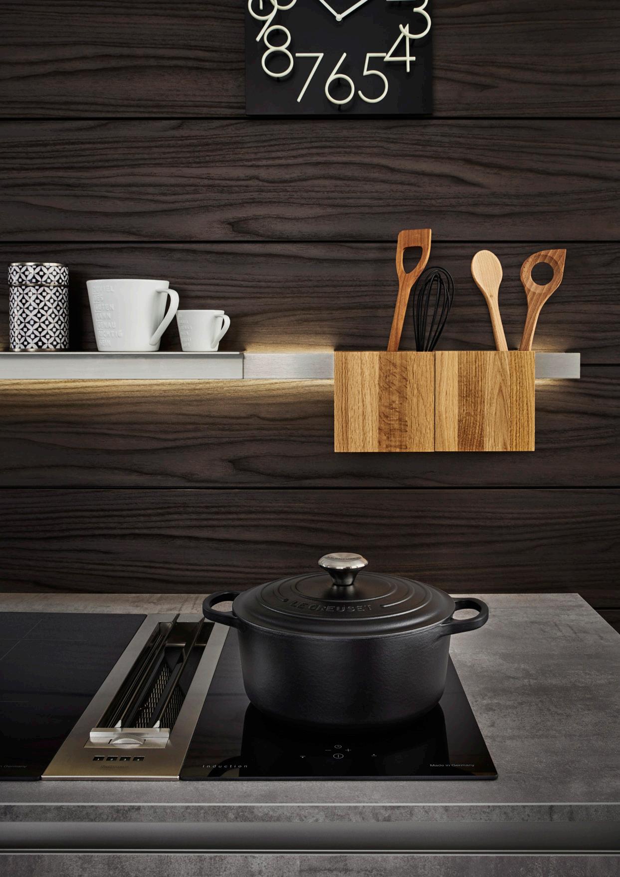 BOSSA, une surface avec application de placage épais et gaufrage vertical. Le revêtement complet du linéaire de cuisine sans poignée ainsi que des armoires adjacentes avec le nouveau programme BOSSA en noyer est une déclaration architecturale qui ne renonce ni à la fonctionnalité ni à l’esthétique.