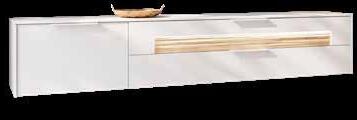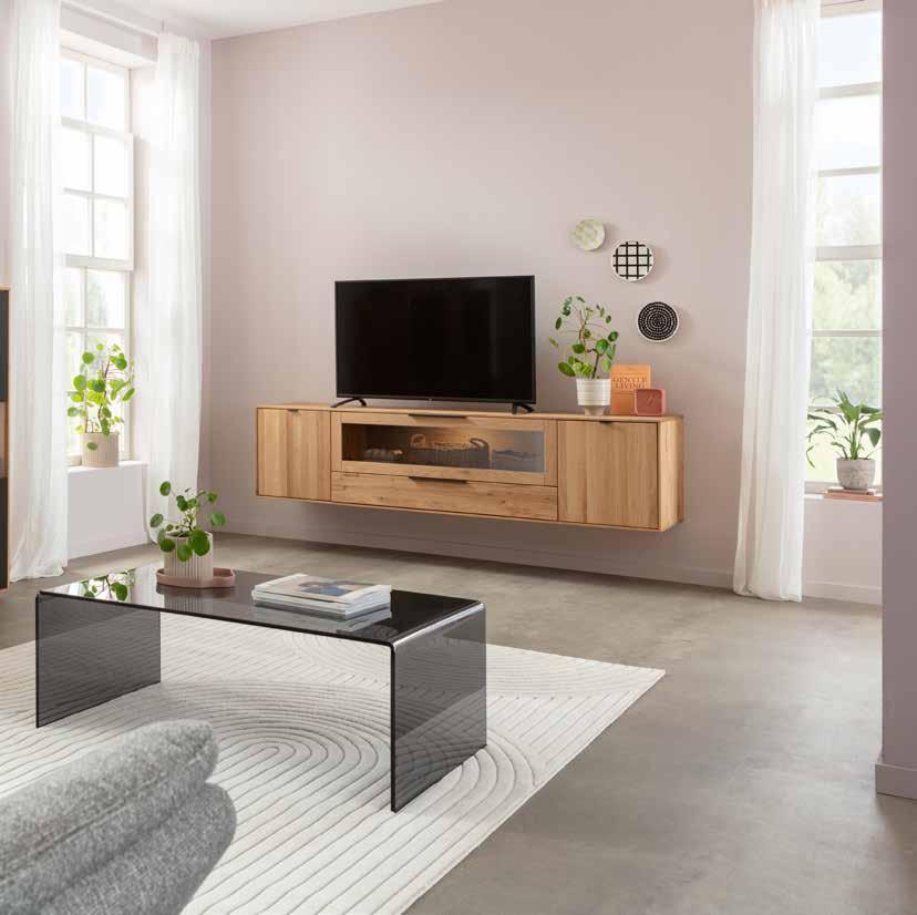 12 Lowboard Genua hängend in der Ausführung Wildeiche roheffekt massiv geölt, ca. 213 x 51 x 45 cm, ohne Beleuchtung