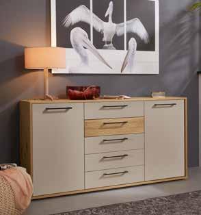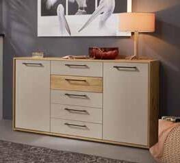 3 Kommode Delia Ausführung Balkeneiche Echtholzfurnier, Front Lack Taube, mit zwei Türen und fünf Schubkästen, 1 Schubkasten Riffholz massiv, ca. B155 x H82 x T40 cm
